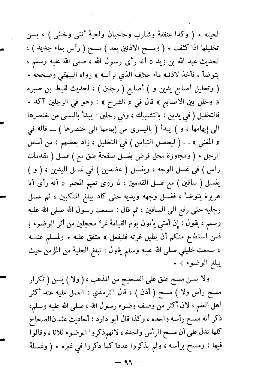 (وَمُجَاوَزَةُ مَحَلِّ فَرْضٍ بِغَسْلِ صَفْحَةِ عُنُقٍ مَعَ) غَسْلِ (مُقَدِّمَاتِ رَأْسٍ) فِي غَسْلِ الْوَجْهِ، وَيَغْسِلُ (عَضُدَيْنِ) فِي غَسْلِ الْيَدَيْنِ، (وَ) يَغْسِلُ (سَاقَيْنِ) مَعَ غَسْلِ الْقَدَمَيْنِ، لِمَا رَوَى نُعَيْمٌ الْمُجْمِرُ " أَنَّهُ رَأَى أَبَا هُرَيْرَةَ يَتَوَضَّأُ، فَغَسَلَ وَجْهَهُ وَيَدَيْهِ حَتَّى كَادَ يَبْلُغُ الْمَنْكِبَيْنِ، ثُمَّ غَسَلَ رِجْلَيْهِ حَتَّى رَفَعَ إلَى السَّاقَيْنِ، ثُمَّ قَالَ: سَمِعْتُ رَسُولَ اللَّهِ - صَلَّى اللَّهُ عَلَيْهِ وَسَلَّمَ - يَقُولُ: «إنَّ أُمَّتِي يَأْتُونَ يَوْمَ الْقِيَامَةِ غُرًّا مُحَجَّلِينَ مِنْ أَثَرِ الْوُضُوءِ؛ فَمَنْ اسْتَطَاعَ مِنْكُمْ أَنْ يُطِيلَ غُرَّتَهُ فَلْيَفْعَلْ» مُتَّفَقٌ عَلَيْهِ. وَلِمُسْلِمٍ عَنْهُ " سَمِعْتُ خَلِيلِي - صَلَّى اللَّهُ عَلَيْهِ وَسَلَّمَ - يَقُولُ: «تَبْلُغُ الْحِلْيَةُ مِنْ الْمُؤْمِنِ حَيْثُ يَبْلُغُ الْوُضُوءُ» .