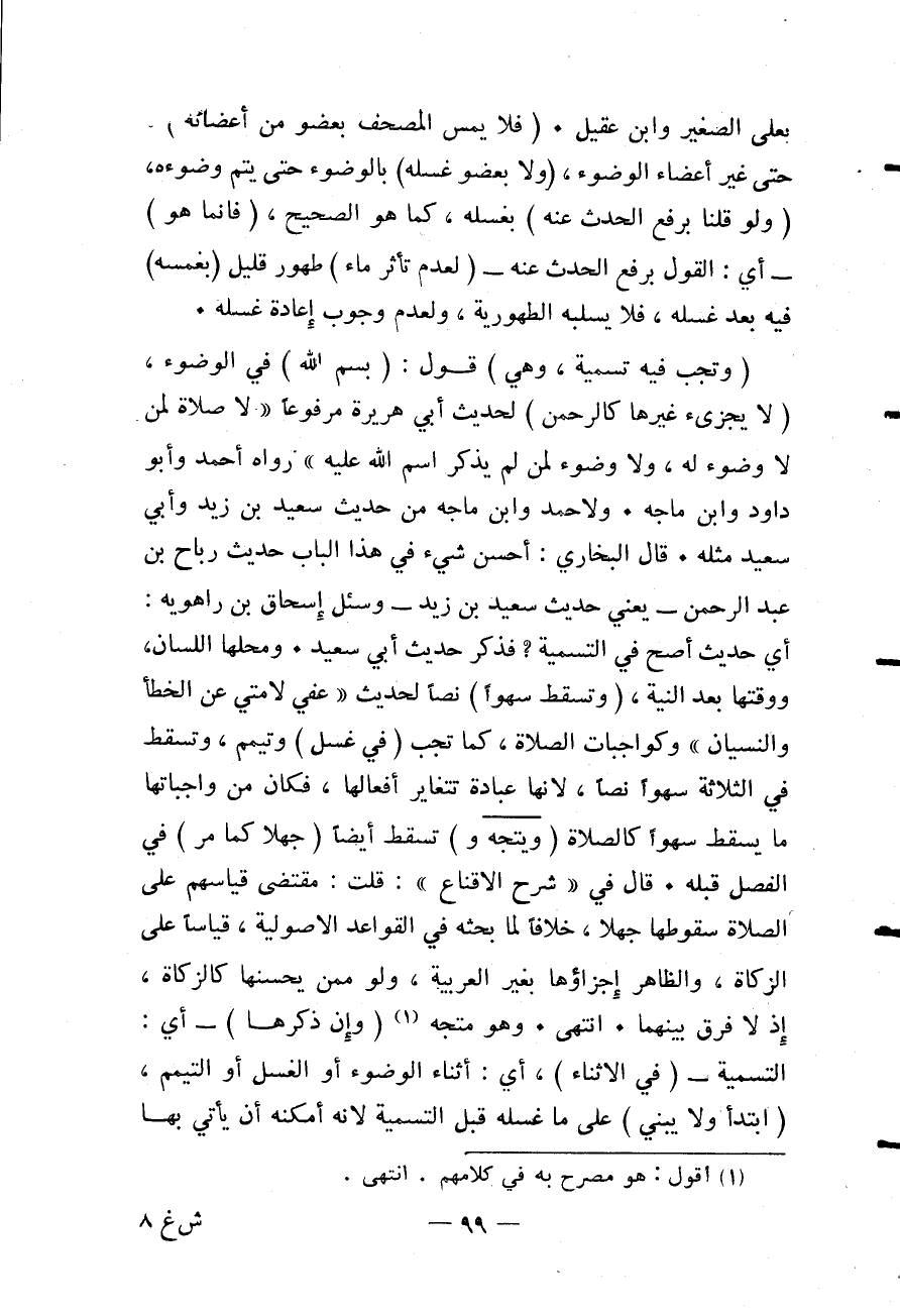 قَالَ فِي شَرْحِ الْإِقْنَاعِ ": قُلْتُ: مُقْتَضَى قِيَاسِهِمْ عَلَى الصَّلَاةِ سُقُوطُهَا جَهْلًا، خِلَافًا لِمَا بَحَثَهُ فِي الْقَوَاعِدِ الْأُصُولِيَّةِ، قِيَاسًا عَلَى الزَّكَاةِ، وَالظَّاهِرُ إجْزَاؤُهَا بِغَيْرِ الْعَرَبِيَّةِ، وَلَوْ مِمَّنْ يُحْسِنُهَا كَالزَّكَاةِ، إذْ لَا فَرْقَ بَيْنَهُمَا. انْتَهَى. وَهُوَ مُتَّجِهٌ (إنْ ذَكَرَهَا) - أَيْ: التَّسْمِيَةَ - (فِي الْأَثْنَاءِ) ، أَيْ: أَثْنَاءِ الْوُضُوءِ أَوْ الْغُسْلِ أَوْ التَّيَمُّمِ، (ابْتَدَأَ وَلَا يَبْنِي) عَلَى مَا غَسَلَهُ قَبْلَ التَّسْمِيَةِ لِأَنَّهُ أَمْكَنَهُ أَنْ يَأْتِيَ بِهَا