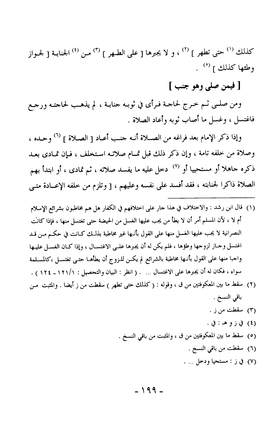 62 - وإذا ذكر الإمام بعد فراغه من الصلاة أنه جنب أعاد [الصلاة] وحده، وصلاة من خلفه تامة، وإن ذكر ذلك قبل تمام صلاته استخلف، فإن تمادى بعد ذكره جاهلاً أو مستحيياً أو دخل عليه ما يفسد صلاته، ثم تمادى، أو ابتدأ بهم الصلاة ذاكراً لجنابته، فقد أفسد على نفسه وعليهم، [وتلزم من خلفه الإعادة متى