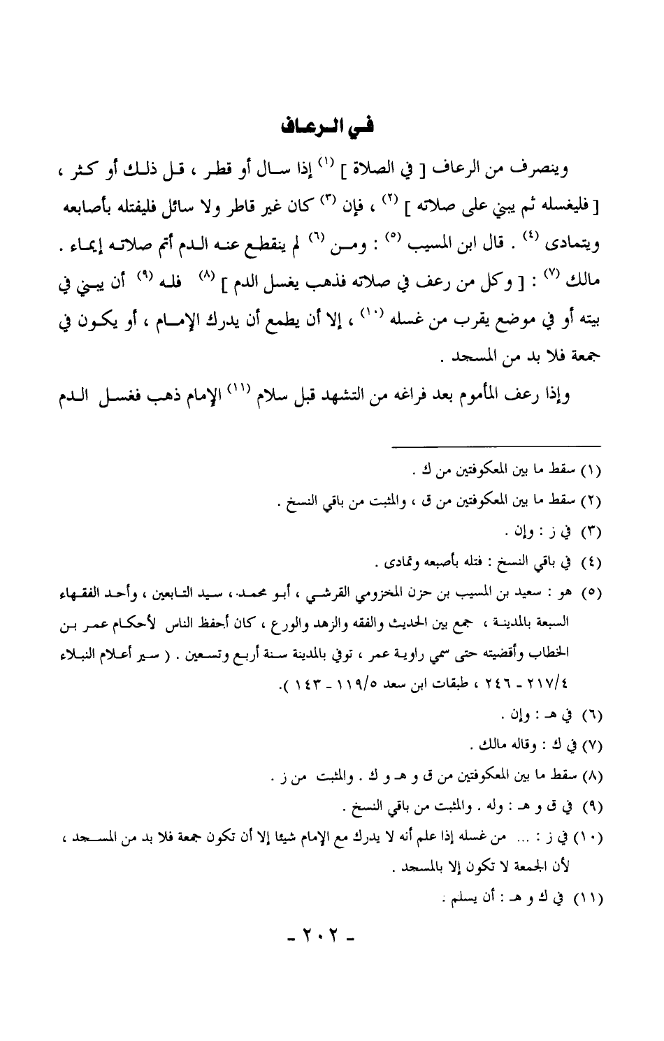 67 - وينصرف من الرعاف [في الصلاة] إذا سال أو قطر، قل ذلك أو كثر، [فليغسله ثم يبني على صلاته] ، فإن كان غير قاطر ولا سائل فليفتله بأصابعه ويتمادى. اقل ابن المسيب: ومن لم ينقطع عنه الدم أتم صلاته إيماء. مالك: [وكل من رعف في صلاته فذهب يغسل الدم] فله أن يبني في بيته أو في موضع يقرب من غسله، إلا أن يطمع أن يدرك الإمام، أو يكون في جمعة فلا بد من المسجد. (¬2)