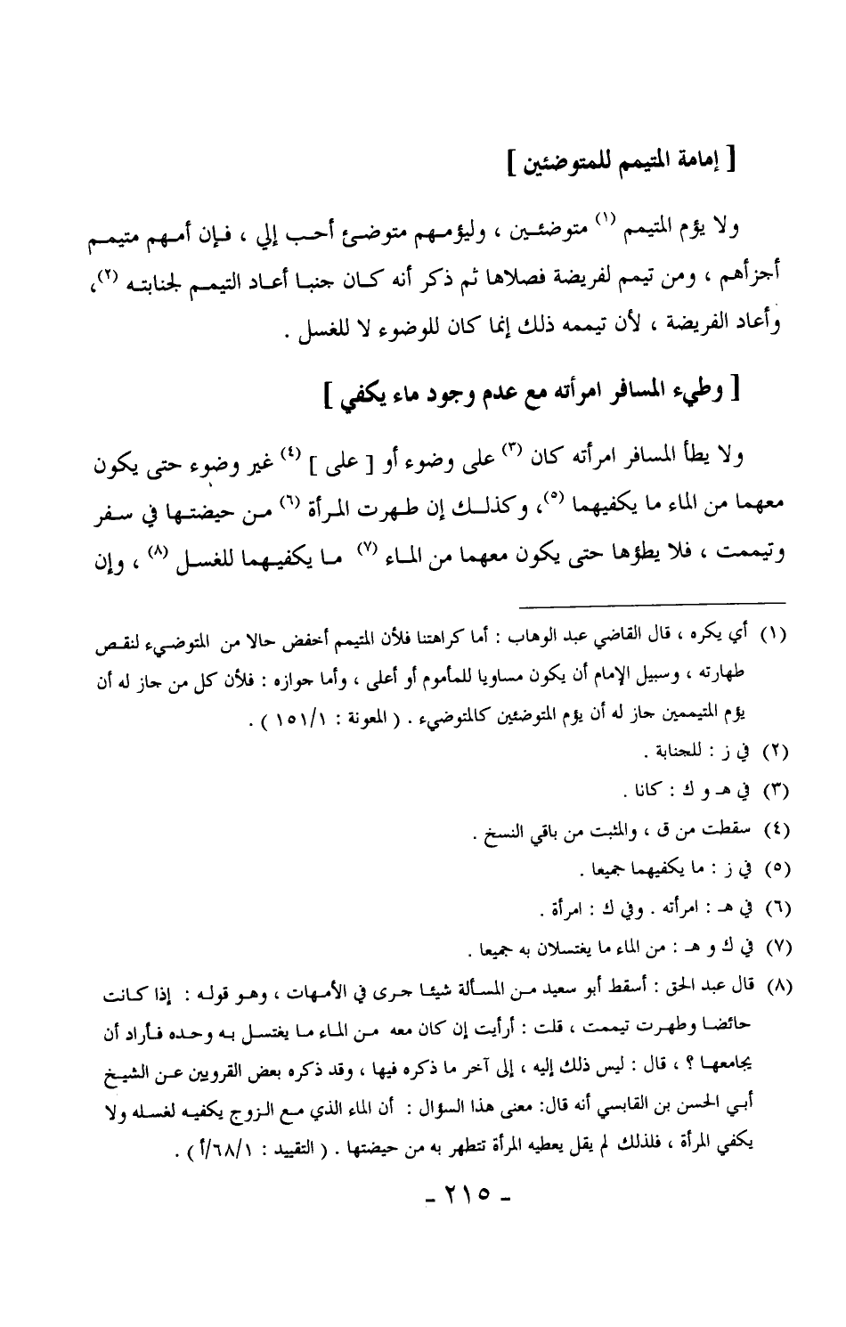 94 - ولا يطأ المسافر امرأته كان على وضوء أو [على] غير وضوء حتى يكون معهما من الماء ما يكفيهما جميعاً، وكذلك إن طهرت المرأة من حيضتها في سفر وتيممت، فلا يطؤها حتى يكون معهما من الماء ما يكفيهما للغسل، وإن