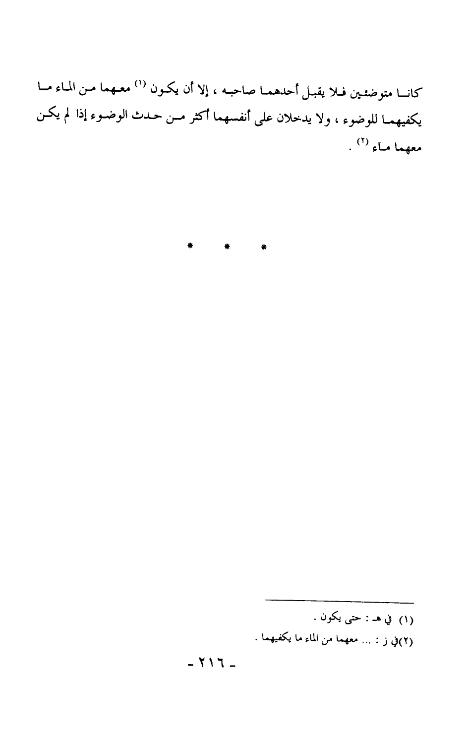 كانا متوضئين فلا يقبل أحدهما صاحبه، إلا أن يكون معهما من الماء يكفيهما للوضوء، ولا يدخلان على أنفسهما أكثر من حدث الوضوء إذا لم يكن معهما ماء. (¬1)
