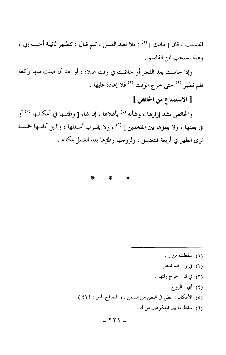 104 - والحائض تشد إزارها، وشأنه بأعلاها (¬1) ، إن شاء [وطئها في أعكانها (¬2) أو في بطنها، ولا يطؤها بين الفخذين] ، ولا يقرب أسفلها، والتي أيامها خمسة ترى الطهر في أربعة فلتغتسل، ولزوجها وطؤها بعد الغسل مكانه.