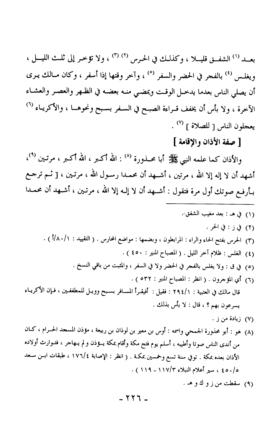 117 - والأذان كما علمه النبي ÷ أبا محذورة: الله أكبر، الله أكبر، مرتين، أشهد أن لا إله إلا الله، مرتين، أشهد أن محمداً رسول الله، مرتين، [ثم ترجع بأرفع صوتك أول مرة فتقول: أشهد أن لا إله إلا الله، مرتين، أشهد أن محمداً