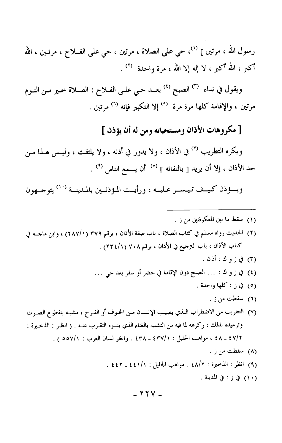 118 - ويكره التطريب في الأذان، ولا يدور في أذنه، ولا يلتفت، وليس هذا من حد الأذان، إلا أن يريد [بالتفاته] أن يسمع الناس.