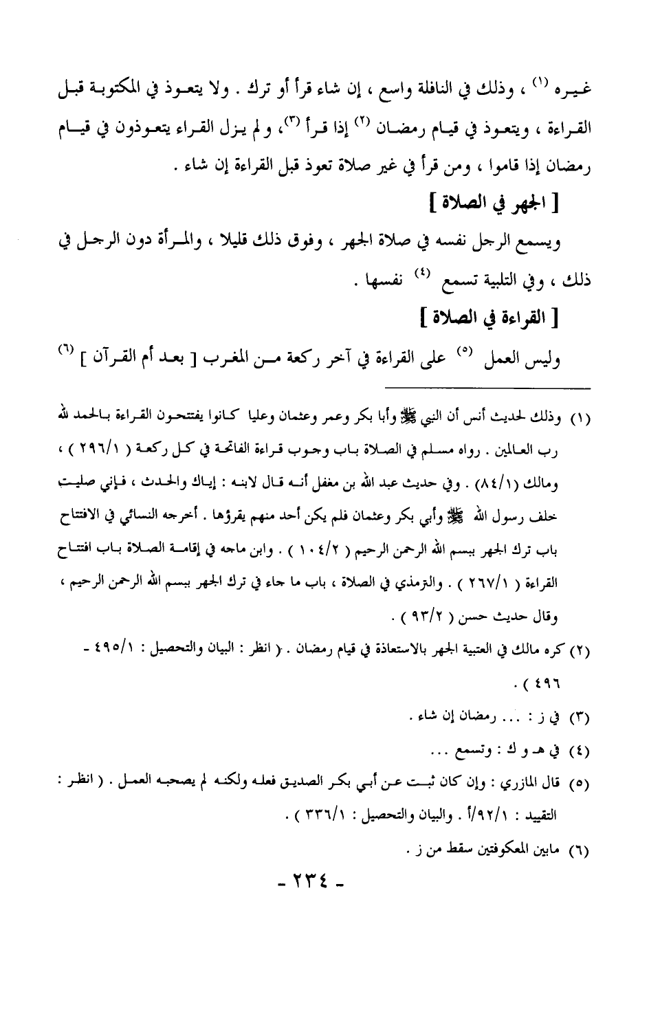 134 - ويسمع الرجل نفسه في صلاة الجهر، وفوق ذلك قليلاً، والمرأة دون الرجل في ذلك، وفي التلبية تسمع نفسها.