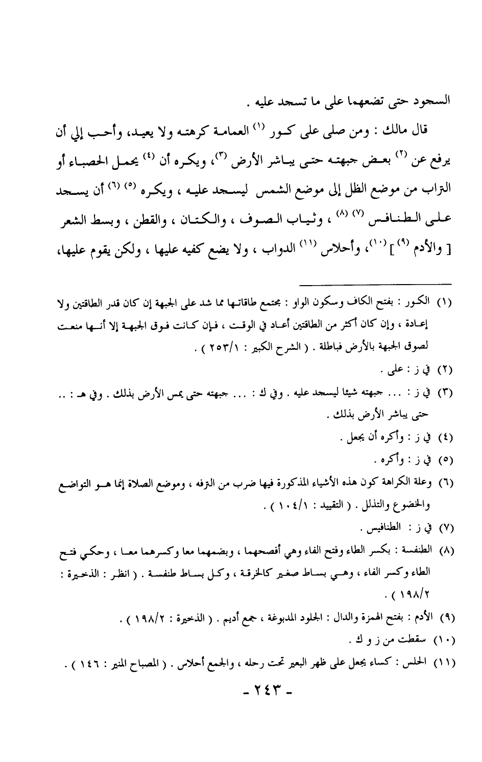 150 - قال مالك: ومن صلى على كور (¬1) العمامة كرهته ولا يعيد، وأحب إلي أن يرفع عن بعض جبهته حتى يباشر الأرض، ويكره أن يحمل الحصباء أو التراب من موضع الظل إلى موضع الشمس ليسجد عليه، ويكره أن يسجد على الطنافس (¬2) ، وثياب الصوف، والكتان، والقطن، وبسط الشعر [والأدم] ، وأحلاس (¬3) الدواب، ولا يضع كفيه عليها، ولكن يقوم عليها،