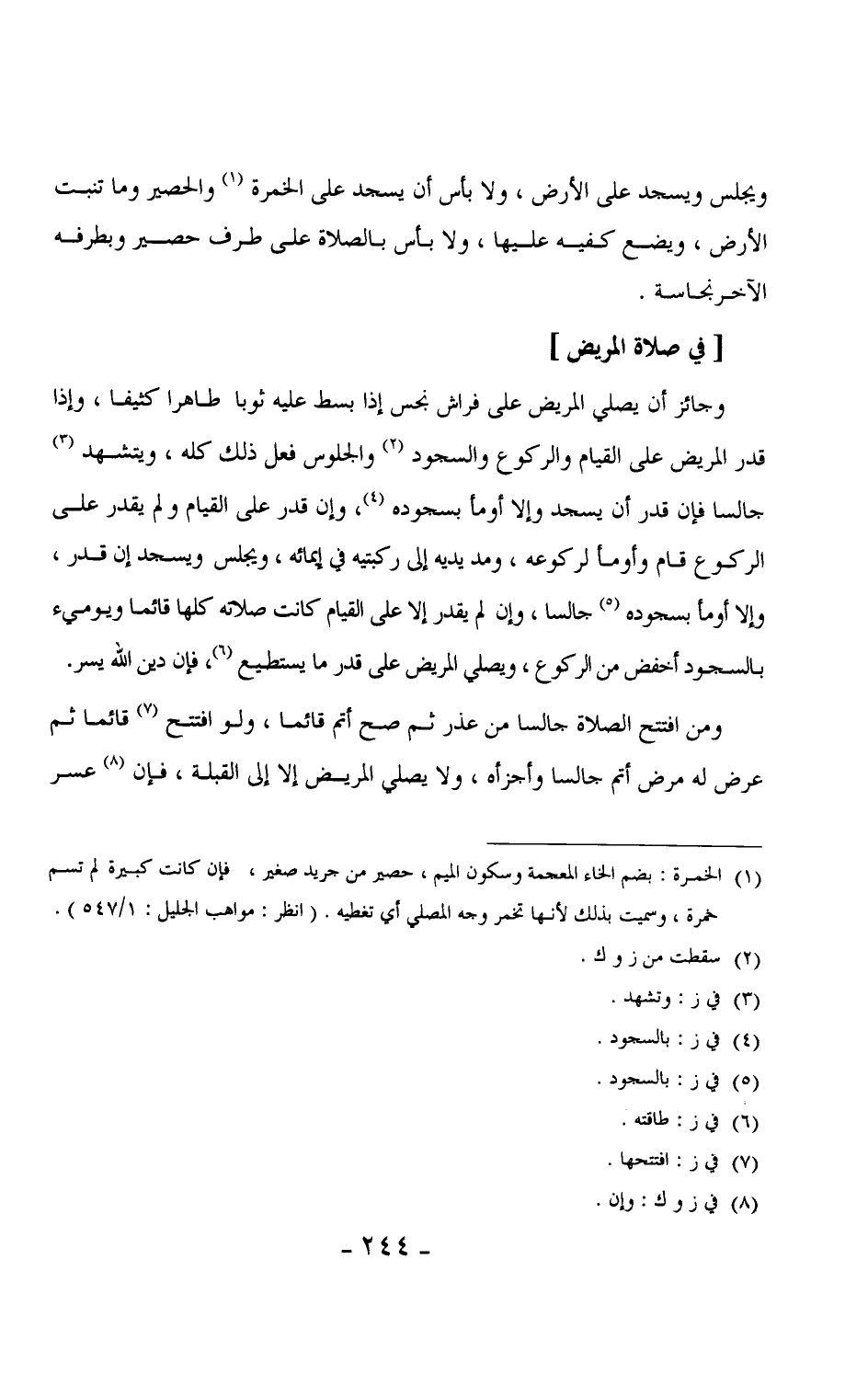 151 - وجائز أن يصلي المريض على فراش نجس إذا بسط عليه ثوباً طاهراً كثيفاً، وإذا قدر المريض على القيام والركوع والسجود والجلوس فعل ذلك كله، ويتشهد جالساً فإن قدر أن يسجد وإلا أومأ بسجوده، وإن قدر على القيام ولم يقدر على الركوع قام وأومأ لركوعه، ومد يديه إلى ركبتيه في إيمائه، ويجلس ويسجد إن قدر، وإلا أومأ بسجوده جالساً، وإن لم يقدر إلا على القيام كانت صلاته كلها قائماً ويومئ بالسجود أخفض من الركوع، ويصلي المريض على قدر ما يستطيع، فإن دين الله يسر.