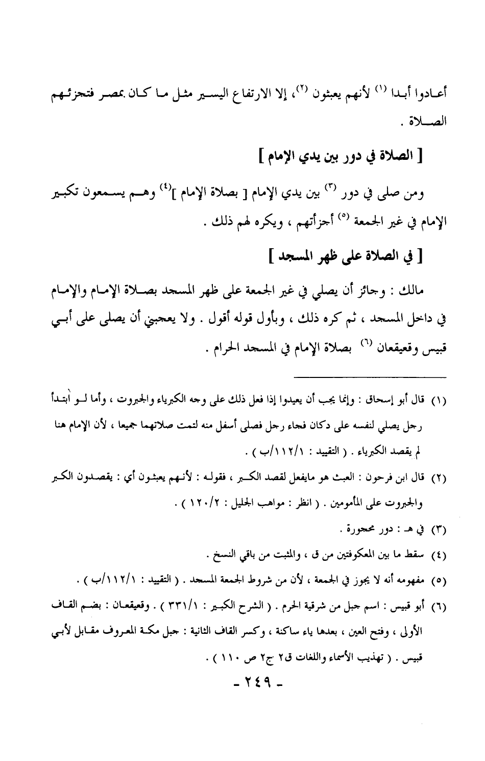 161 - مالك: وجائز أن يصلي في غير الجمعة على ظهر المسجد بصلاة الإمام والإمام في داخل المسجد، ثم كره ذلك، وبأول قوله أقول. ولا يعجبني أن يصلي على أبي قبيس (¬1) وقعيقعان (¬2) بصلاة الإمام في المسجد الحرام.
