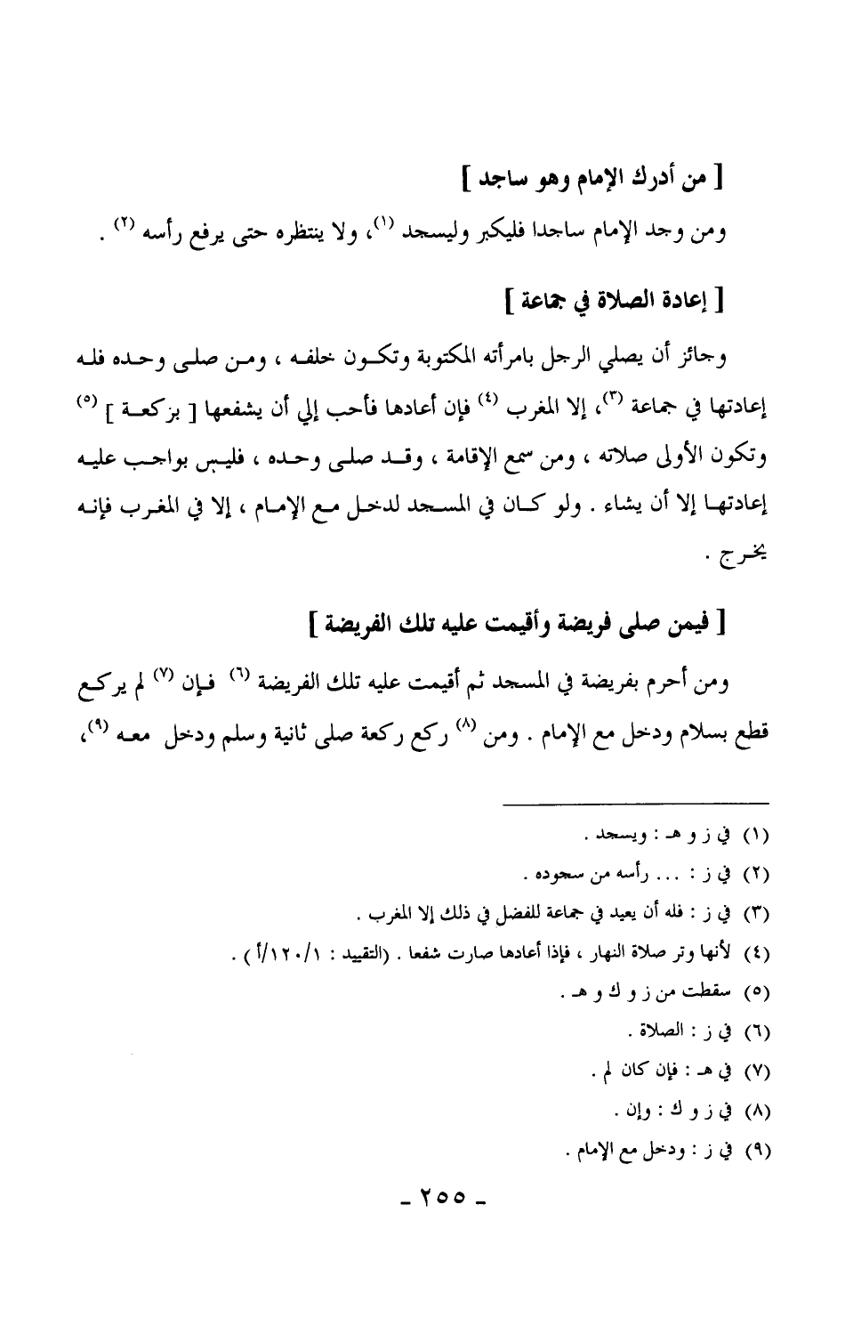 177 - ومن أحرم بفريضة في المسجد ثم أقيمت عليه تلك الفريضة فإن لم يركع قطع بسلام ودخل مع الإمام. ومن ركع ركعة صلى ثانية وسلم ودخل معه.