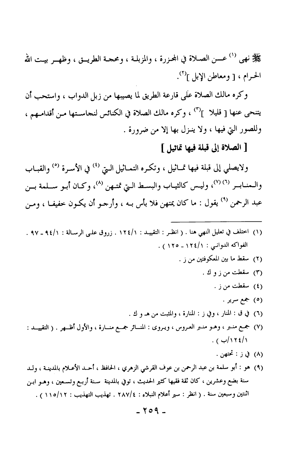 188 - ولا يصلي إلى قبلة فيها تماثيل، وتكره التماثيل التي في الأسرة والقباب والمنابر، وليس كالثياب والبسط التي تمتهن، وكان أبو سلمة بن عبد الرحمن يقول: ما كان يمتهن فلا بأس به، وأرجو أن يكون خفيفاً، ومن