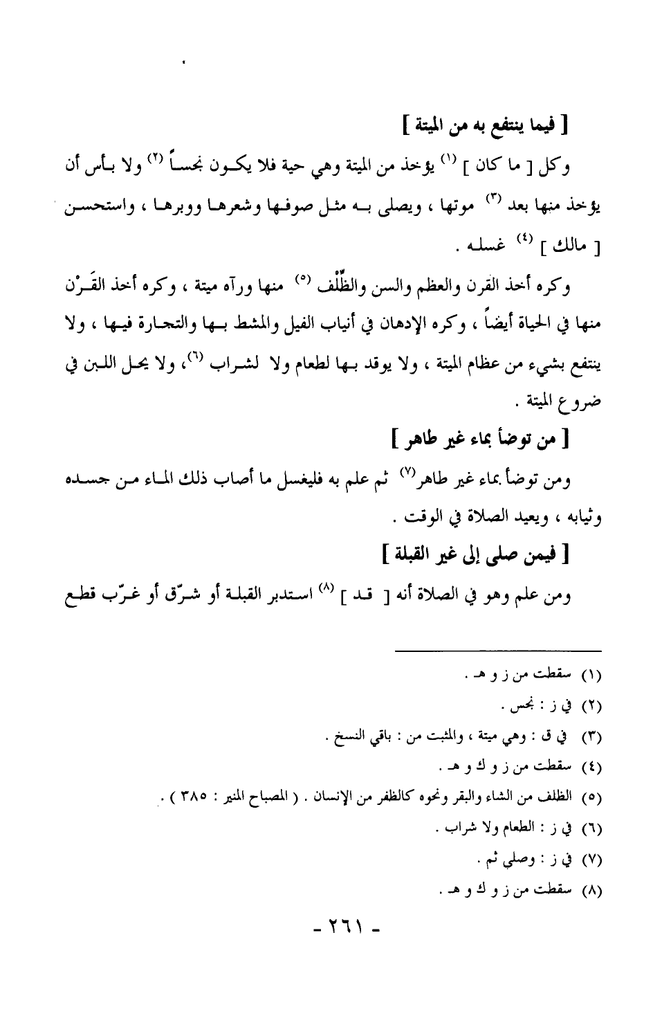 191 - وكل بما كان] يؤخذ من الميتة وهي حية فلا يكون نجساً ولا بأس أن يؤخذ منها بعد موتها، ويصلى به مثل صوفها وشعرها ووبرها، واستحسن [مالك] غسله.