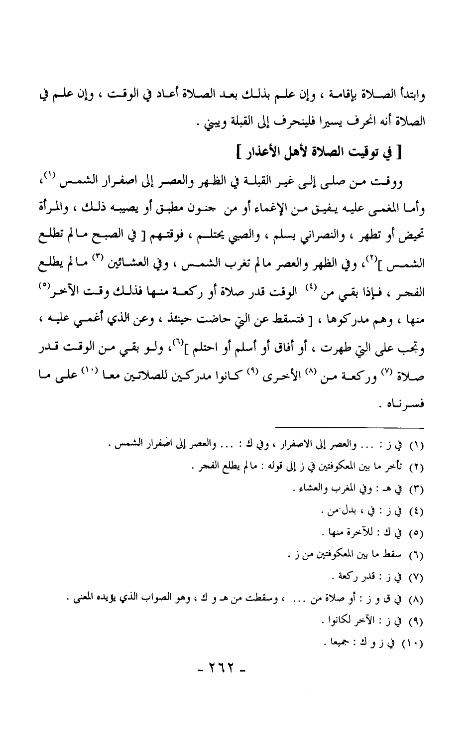 195 - ووقت من صلى إلى غير القبلة في الظهر والعصر إلى اصفرار الشمس، وأما المغمى عليه يفيق من الإغماء أو من جنون مطبق أو يصيبه ذلك، والمرأة تحيض أو تطهر، والنصراني يسلم، والصبي يحتلم، فوقتهم [في الصبح ما لم تطلع الشمس] ، وفي الظهر والعصر ما لم تغرب الشمس، وفي العشائين ما لم يطلع الفجر، فإذا بقي من الوقت قدر صلاة أو ركعة منها فذلك وقت الآخر منها، وهم مدركوها، [فتسقط عن التي حاضت حينئذ، وعن الذي أغمي عليه، وتجب على التي طهرت، أو أفاق أو أسلم أو احتلم] ، ولو بقي من الوقت قدر صلاة وركعة من الأخرى كانوا مدركين للصلاتين معاً على ما فسّرناه.