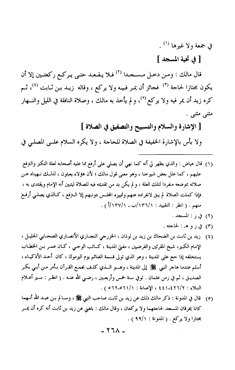 204 - قال مالك: ومن دخل مسجداً فلا يقعد حتى يركع ركعتين إلا أن يكون مجتازاً لحاجة فجائز أن يمر فيه ولا يركع، وقاله زيد بن ثابت، ثم كره زيد أن يمر فيه ولا يركع، ولم يأخذ به مالك، وصلاة النافلة في الليل والنهار مثنى مثنى.
