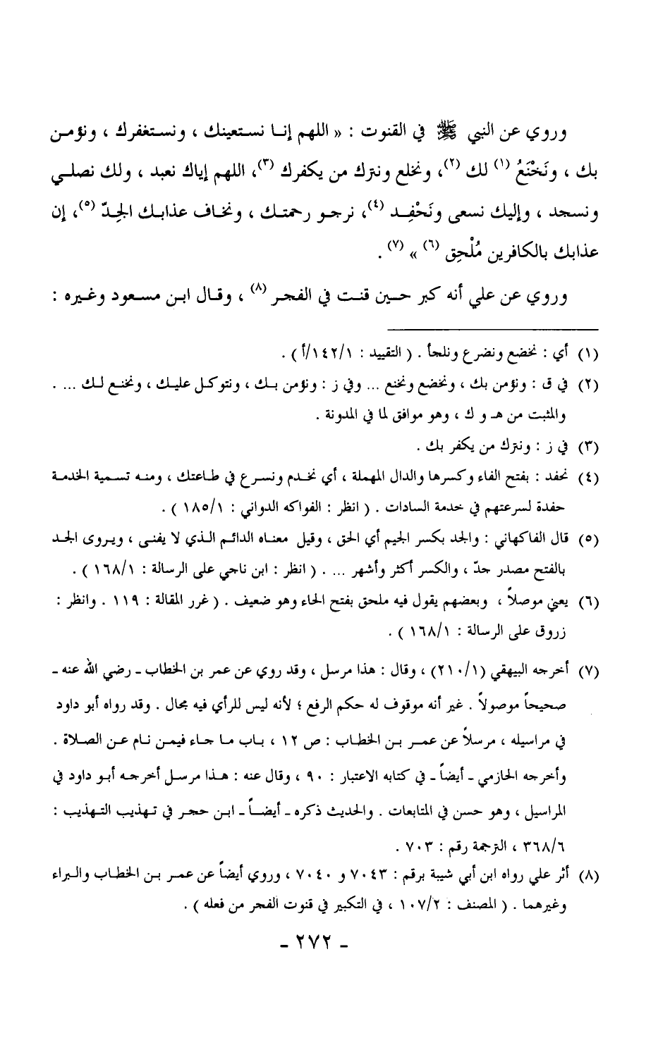 211 - وروي عن النبي ÷ في القنوت: "اللهم إنا نستعينك، ونستغفرك، ونؤمن بك، ونَخْنَع لك، ونخلع ونترك من يكفرك، اللهم إياك نعبد، ولك نصلي ونسجد، وإليك نسعى ونَحْفِد، نرجو رحمتك، ونخاف عذابك الجِدّ، إن عذابك بالكافرين مُلْحِق". (¬1)