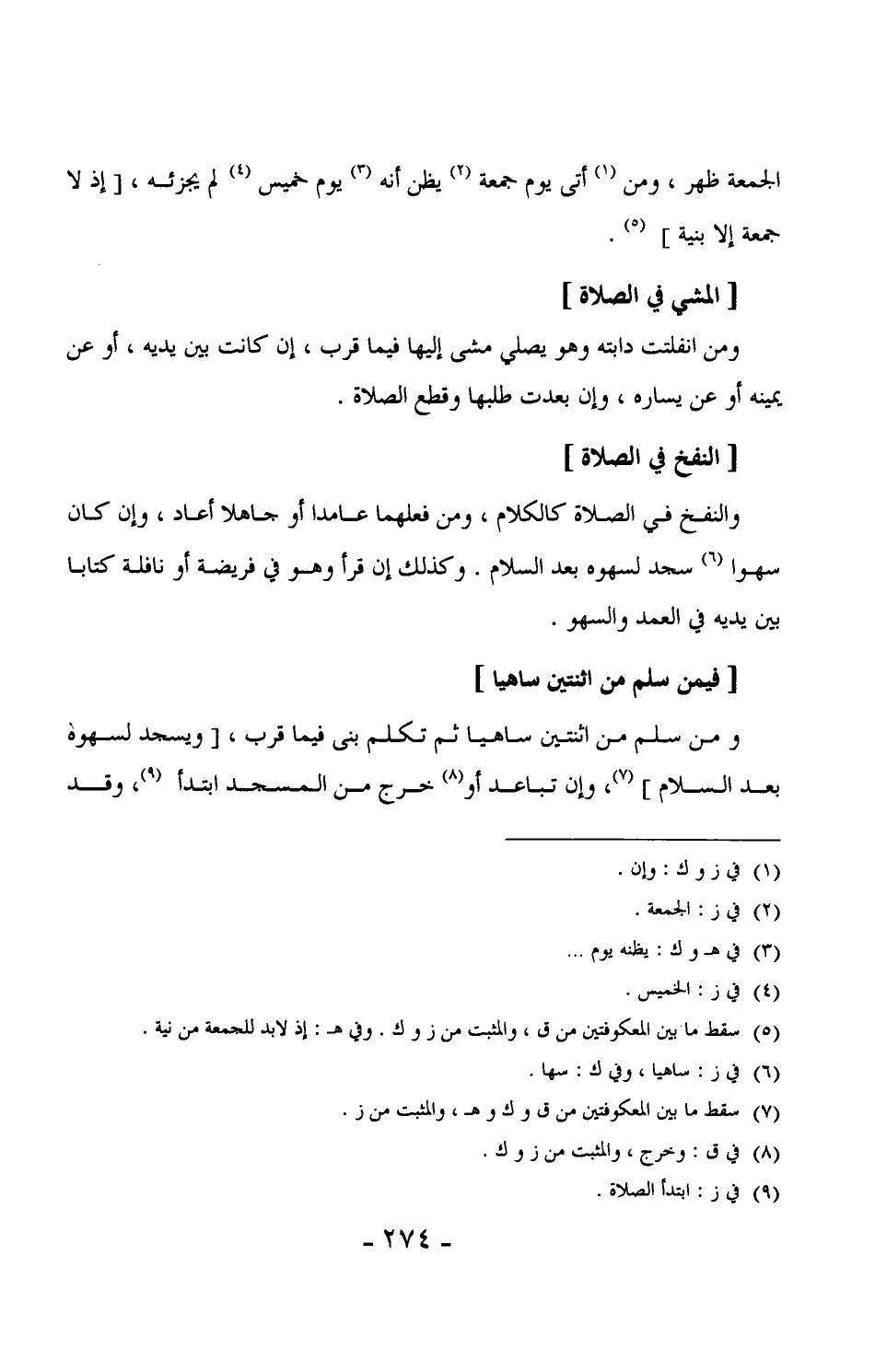 217 - والنفخ في الصلاة كالكلام، ومن فعلهما عامداً أو جاهلاً أعاد، وإن كان سهواً سجد لسهوه بعد السلام. وكذلك إن قرأ وهو في فريضة أو نافلة كتاباً بين يديه في العمد والسهو.