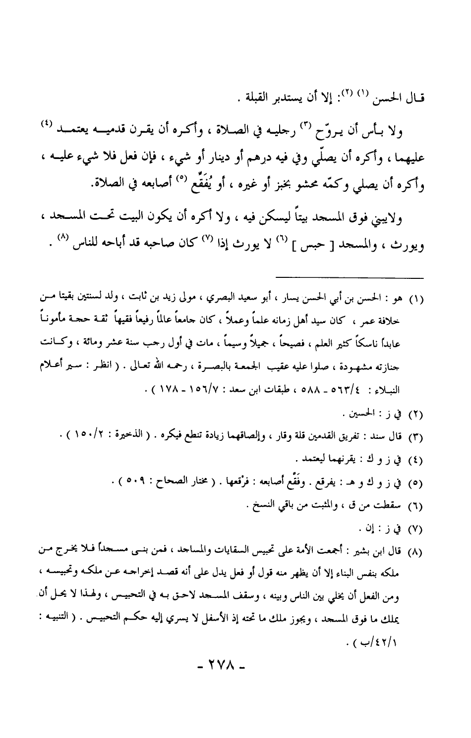 228 - ولا بأس أن يروّح رجليه في الصلاة، وأكره أن يقرن قدميه يعتمد عليهما، وأكره أن يصلي وفي فيه درهم أو دينار أو شيء، فإن فعل فلا شيء عليه، وأكره أن يصلي وكمّه محشر بخبز أو غيره، أو يُفقّع أصابعه في الصلاة. (¬1)