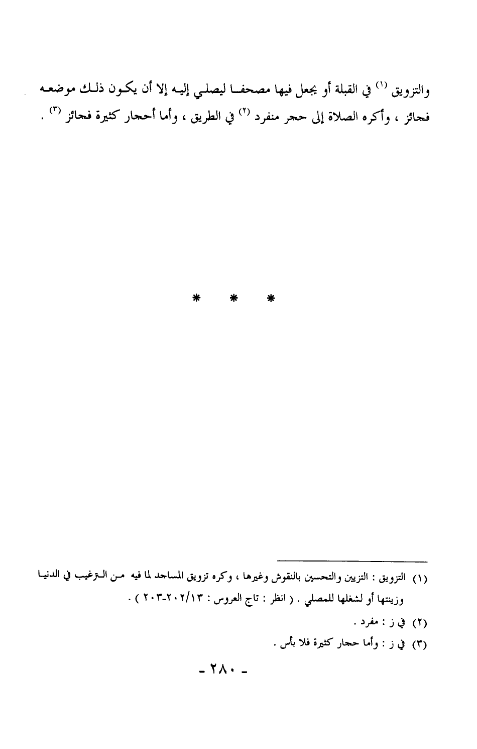 والتزويق في القبلة أو يجعل فيها مصحفاً ليصلي إليه إلا أن يكون ذلك موضعه فجائز، وأكره الصلاة إلى حجر منفرد في الطريق، وأما أحجار كثيرة فجائز. (¬1)