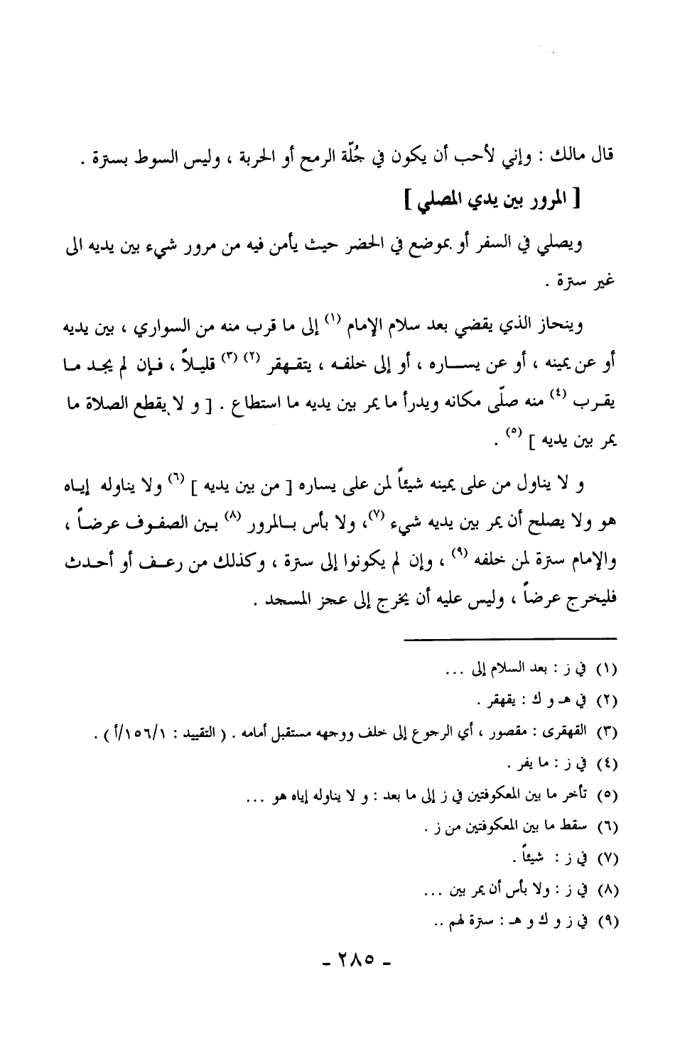 243 - وينحاز الذي يقضي بعد سلام الإمام إلى ما قرب منه من السّواري، بين يديه أو عن يمينه، أو عن يساره، أو إلى خلفه، يتقهقر قليلاً، فإن لم يجد ما يقرب منه صلى مكانه ويدرأ ما يمر بين يديه ما استطاع. [ولا يقطع الصلاة ما يمر بين يديه] .