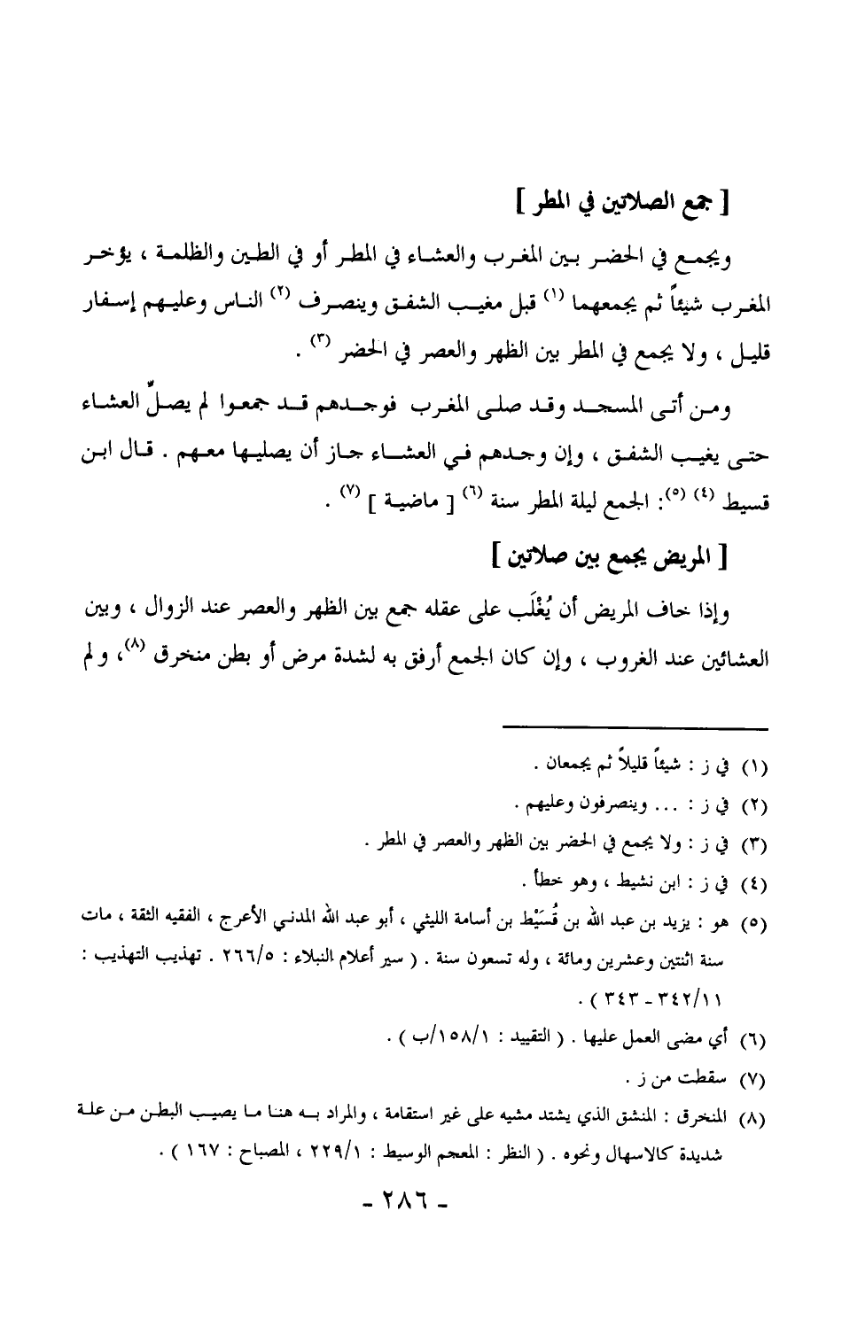 245 - ويجمع في الحضر بين المغرب والعشاء في المطر أو في الطين والظلمة، يؤخر المغرب شيئاً ثم يجمعهما قبل مغيب الشفق وينصرف الناس وعليهم إسفار قليل، ولا يجمع في المطر بين الظهر والعصر في الحضر.