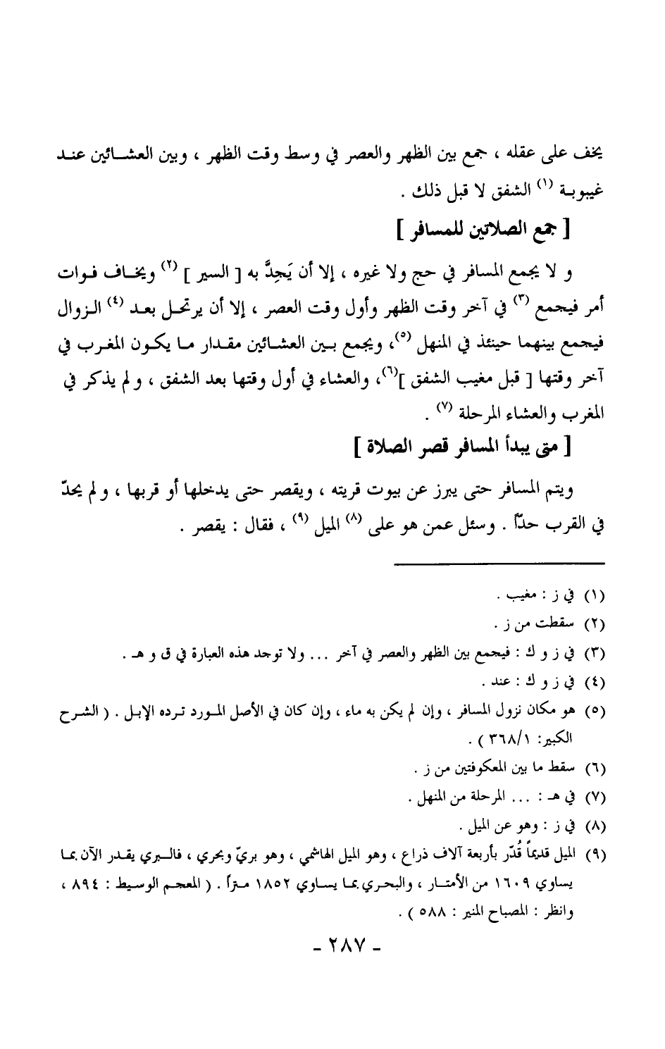 248 - ولا يجمع المسافر في حج ولا غيره، إلا أن يَجِدّ به [السير] (¬1) ويخاف فوات أمر فيجمع في آخر وقت الظهر وأول وقت العصر، إلا أن يرتحل بعد النزوال فيجمع بينهما حينئذ في المنهل (¬2) ، ويجمع بين العشائين مقدار ما يكون المغرب في آخر وقتها [قبل مغيب الشفق] ، والعشاء في أول وقتها بعد الشفق، ولم يذكر في المغرب والعشاء المرحلة. (¬3)