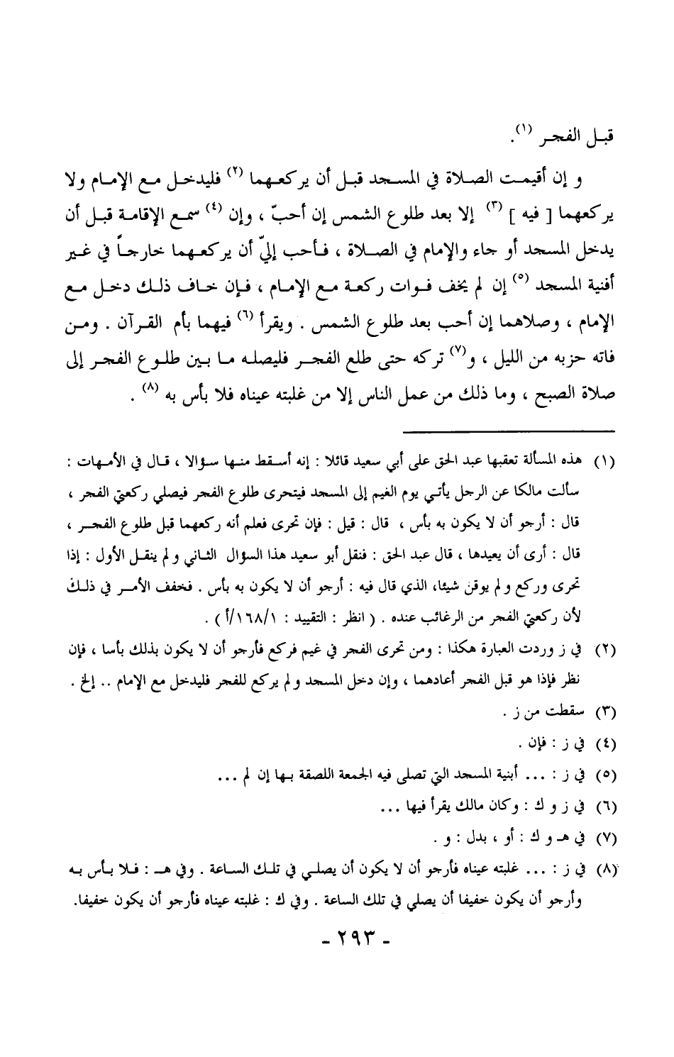 262 - وإن أقيمت الصلاة في المسجد قبل أن يركعهما فليدخل مع الإمام ولا يركعهما [فيه] إلا بعد طلوع الشمس إن أحب، وإن سمع الإقامة قبل أن يدخل المسجد أو جاء والإمام في الصلاة، فأحب إلي أن يركعهما خارجاً في غير أفنية المسجد إن لم يخف فوات ركعة مع الإمام، فإن خاف ذلك دخل مع الإمام، وصلاهما إن أحب بعد طلوع الشمس. ويقرأ فيهما بأم القرآن. ومن فاته حزبه من الليل، وتركه حتى طلع الفجر فليصله ما بين طلوع الفجر إلى صلاة الصبح، وما ذلك من عمل الناس إلا من غلبته عيناه فلا بأس به. (¬1)