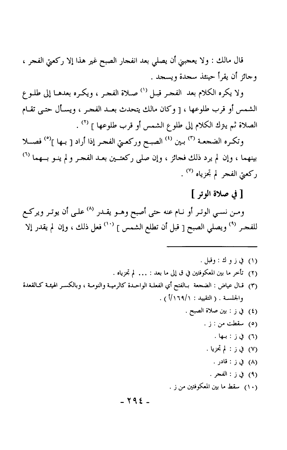 266 - ومن نسي الوتر أو نام عنه حتى أصبح وهو يقدر على أن يوتر ويركع للفجر ويصلي الصبح [قبل أن تطلع الشمس] فعل ذلك، وإن لم يقدر إلا