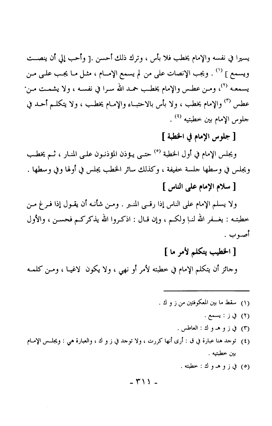324 - ويجلس الإمام في أول الخطبة حتى يؤذن المؤذنون على المنار، ثم يخطب ويجلس في وسطها جلسة خفيفة، وكذلك سائر الخطب يجلس في أولها وفي وسطها.