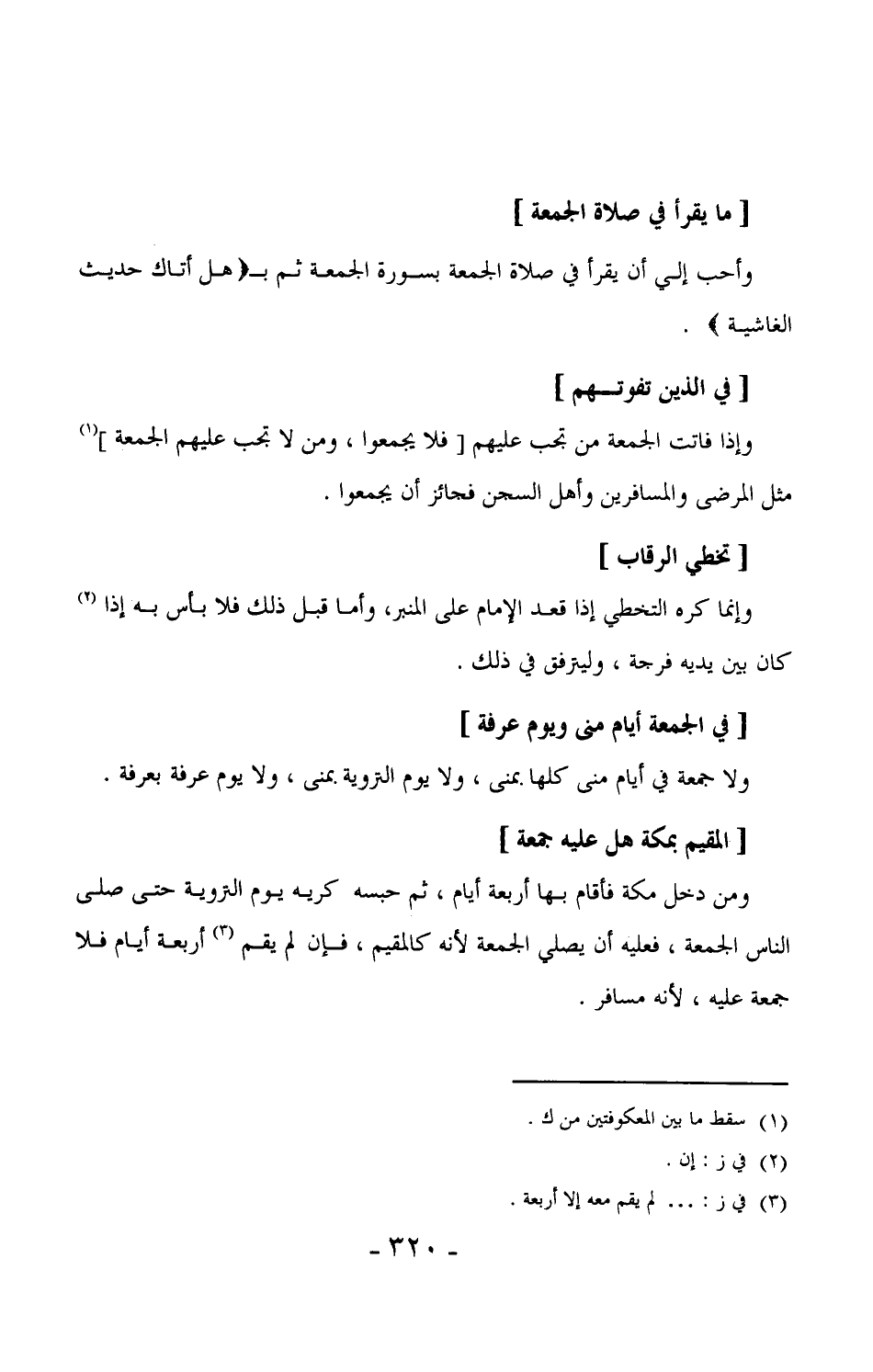 349 - ومن دخل مكة فأقام بها أربعة أيام، ثم حبسه كريه يوم التروية (146) حتى صلى الناس الجمعة، فعليه أن يصلي الجمعة لأنه كالمقيم، فإن لم يقم أربعة أيام فلا جمعة عليه، لأنه مسافر.