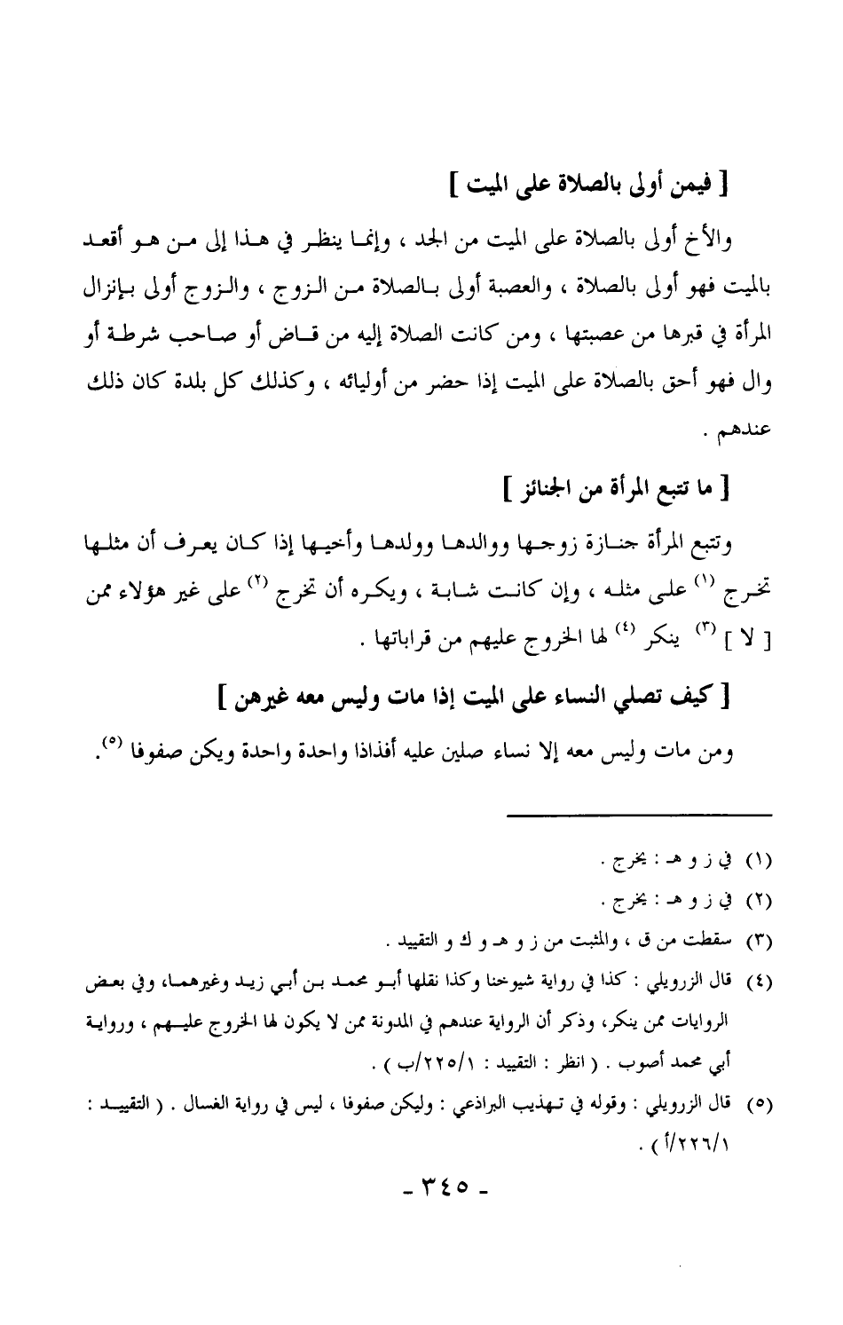 410 - وتتبع المرأة جنازة زوجها ووالدها وولدها وأخيها إذا كان يعرف أن مثلها تخرج على مثله، وإن كانت شابة، ويكره أن تخرج على غير هؤلاء ممن [لا] ينكر لها الخروج عليهم من قراباتها.
