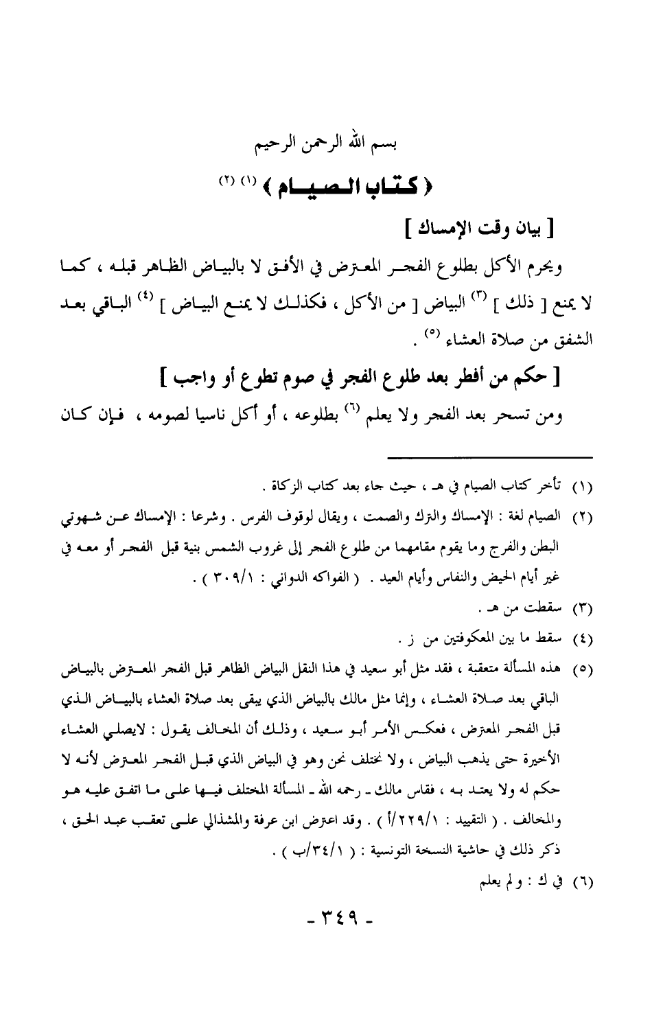 (¬1) الصيام لغة: الإمساك والترك، فمن أمسك عن شيء ما قيل له صائم، وشرعاً: الإمساك عن شهوتي البطن والفرج من طلوع الفجر إلى غروب الشمس بنية قبل الفجر أو معه في غير أيام الحيض والنفاس والأعياد، الثمر الداني (293) . وانظر: الذخيرة للقرافي (2/485) ، والبيان والتحصيل لابن رشد (2/303) ، والشرح الكبير (1/239) ، والتفريع لابن الجلاب (1/301) ، والمعيار للونشريسي (1/410) .