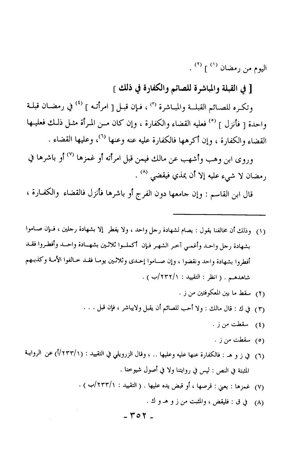 421 - وتكره للصائم القبلة والمباشرة، فإن قبّل [امرأته] في رمضان قبلة واحدة [فأنزل] فعليه القضاء والكفارة، وإن كان من المرأة مثل ذلك فعليها القضاء والكفارة، وإن أكرهها فالكفارة عليه عنه وعنها، وعليها القضاء.