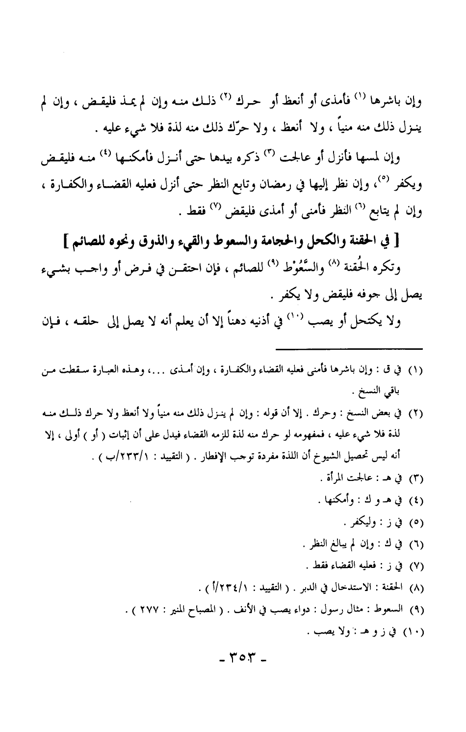 425 - وتكره الحقنة والسعوط (¬1) للصائم، فإن احتقن في فرض أو واجب بشيء يصل إلى جوفه فليقض ولا يكفر.