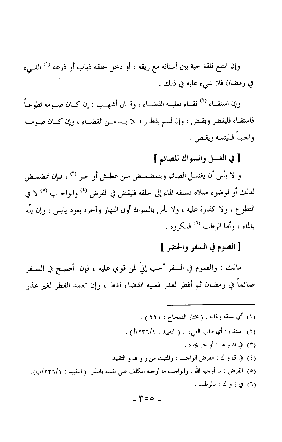 431 - ولا بأس أن يغتسل الصائم ويتمضمض من عطش أو حر، فإن تمضمض لذلك أو لوضوء صلاة فسبقه الماء إلى حلقه فليقض في الفرض والواجب لا في التطوع، ولا كفارة عليه، ولا بأس بالسواك أول النهار وآخره بعود يابس، وإن بلّه بالماء، وأما الرطب فمكروه.