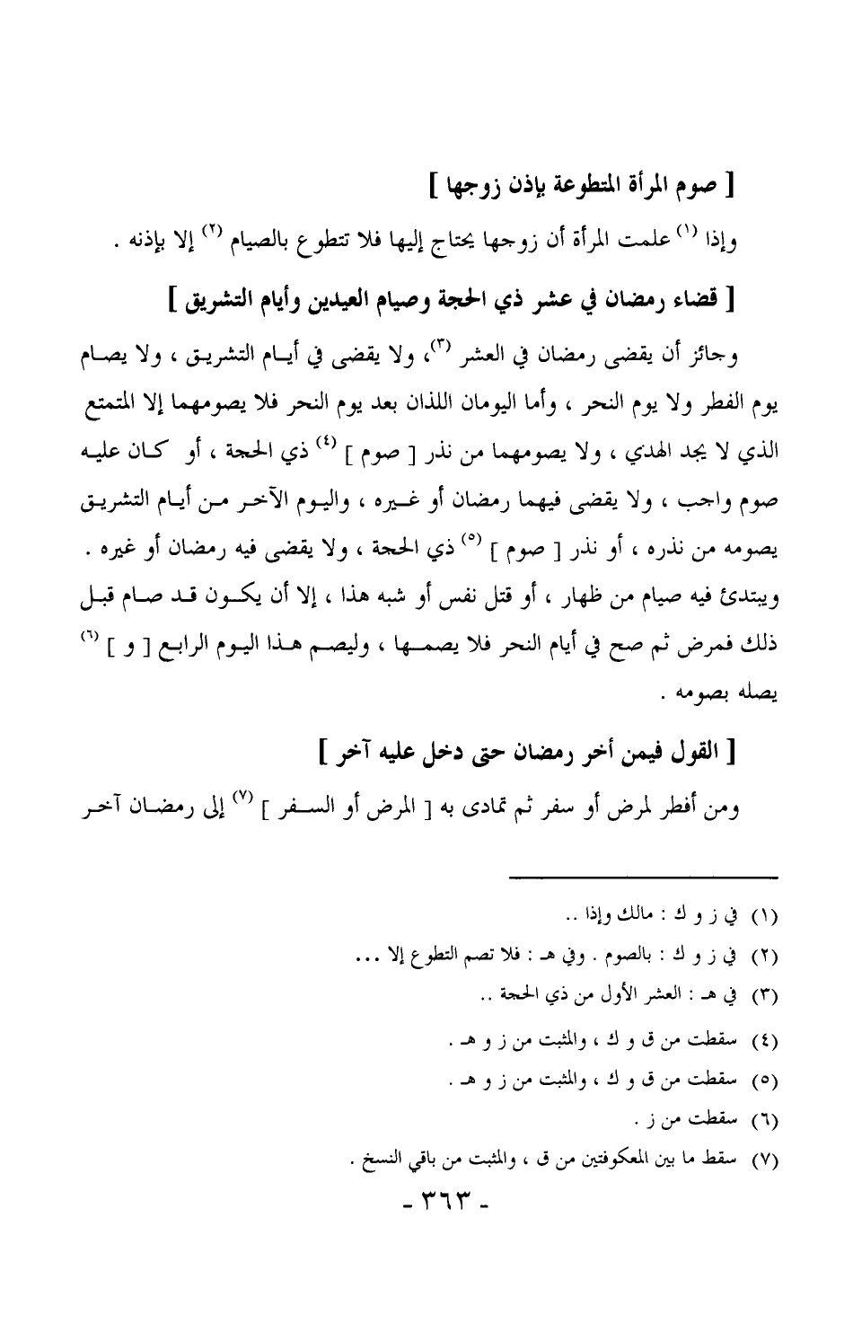 453 - وجائز أن يقضى رمضان في العشر (¬1) ، ولا يقضى في أيام التشريق، ولا يصام يوم الفطر ولا يوم النحر، وأما اليومان اللذان بعد يوم النحر فلا يصومهما إلا المتمتع الذي لا يجد الهدي، ولا يصومهما من نذر [صوم] ذي الحجة، أو كان عليه صوم واجب، ولا يقضي فيهما رمضان أو غيره، واليوم الآخر من أيام التشريق يصومه من نذره، أو نذر [صوم] ذي الحجة، ولا يقضي فيه رمضان أو غيره. ويبتدئ فيه صيام من ظهار، أو قتل نفس أو شبه هذا، إلا أن يكون قد صام قبل ذلك فمرض ثم صح في أيام النحر فلا يصمها، وليصم هذا اليوم الرابع [و] يصله بصومه.