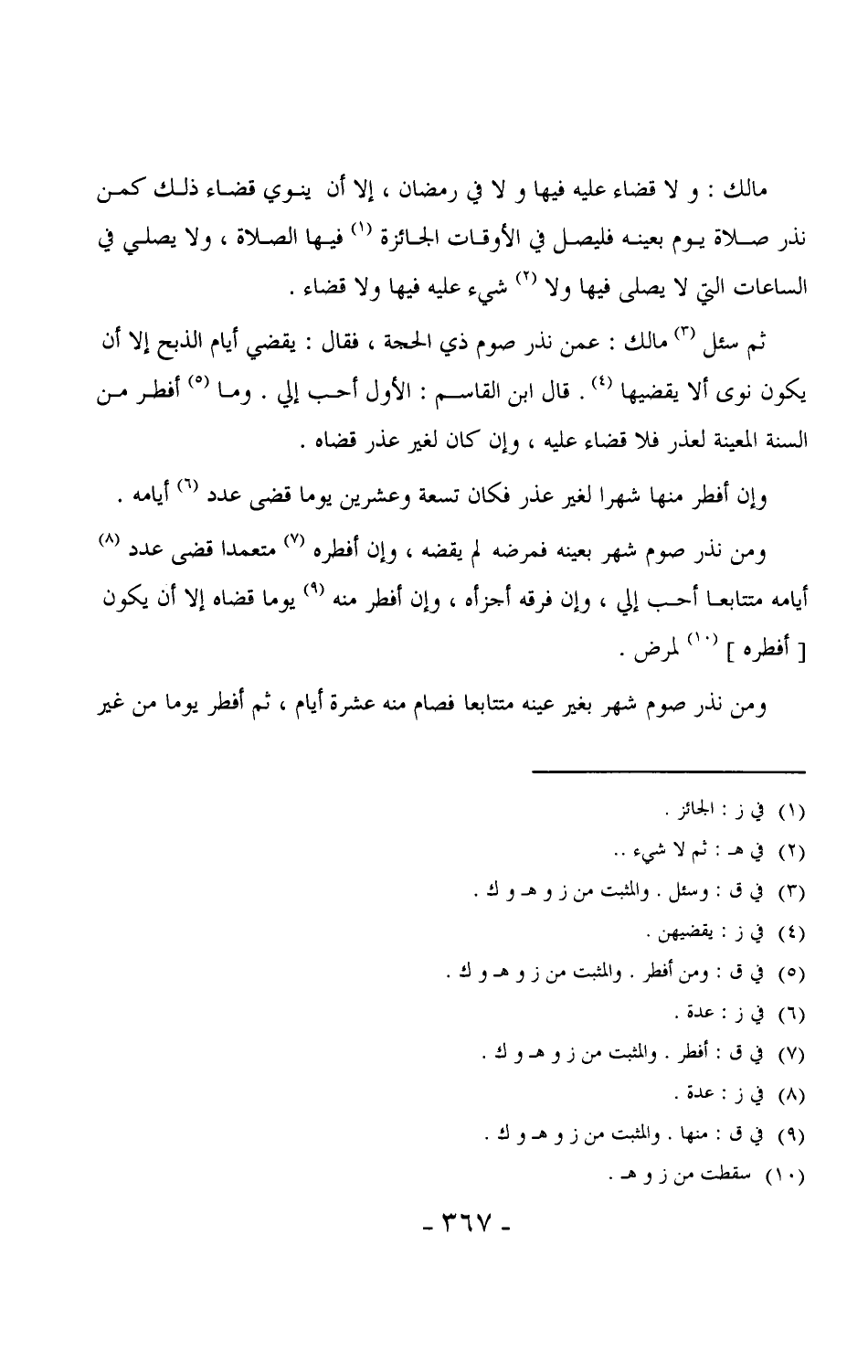 460 - ثم سئل مالك: عمن نذر صوم ذي الحجة، فقال: يقضي أيام الذبح إلا أن يكون نوى إلا يقضيها. قال ابن القاسم: الأول أحب إلي. وما أفطر من السنة المعينة لعذر فلا قضاء عليه، وإن كان لغير عذر قضاه.
