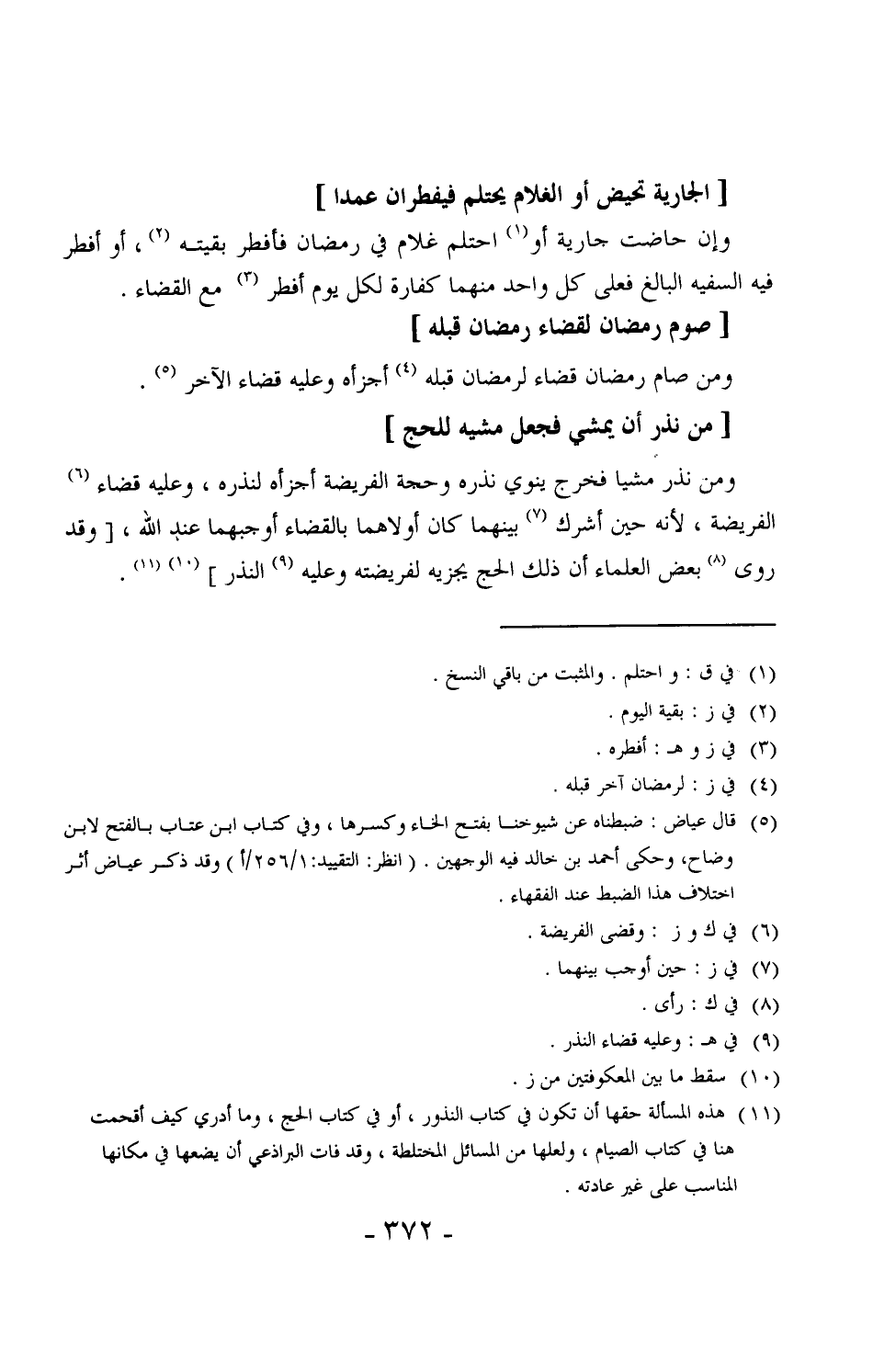 474 - ومن نذر مشياً فخرج ينوي نذره وحجة الفريضة أجزأه لنذره، وعليه قضاء الفريضة، لأنه حين أشرك بينهما كان أولاهما بالقضاء أوجبهما عند الله، [وقد روى بعض العلماء أن ذلك الحج يجزيه لفريضته وعليه النذر] . (20)