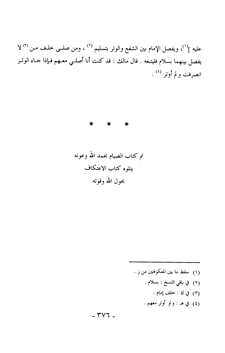عليه] ، ويفصل الإمام بين الشفع والوتر بتسليم، ومن صلى خلف من لا يفصل بينهما بسلام فليتبعه. قال مالك: قد كنت أنا أصلي معهم فإذا جاء الوتر انصرفت ولم أوتر. (¬1)