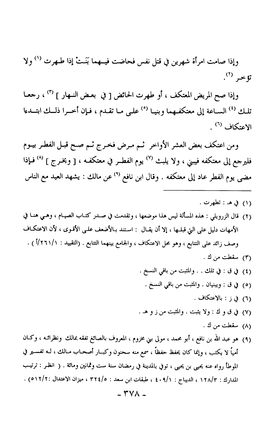 485 - وإذا صح المريض المعتكف، أو طهرت الحائض [في بعض النهار] ، رجعا تلك الساعة إلى معتكفهما وبنيا على ما تقدم، فإن أخرا ذلك ابتدءا الاعتكاف.