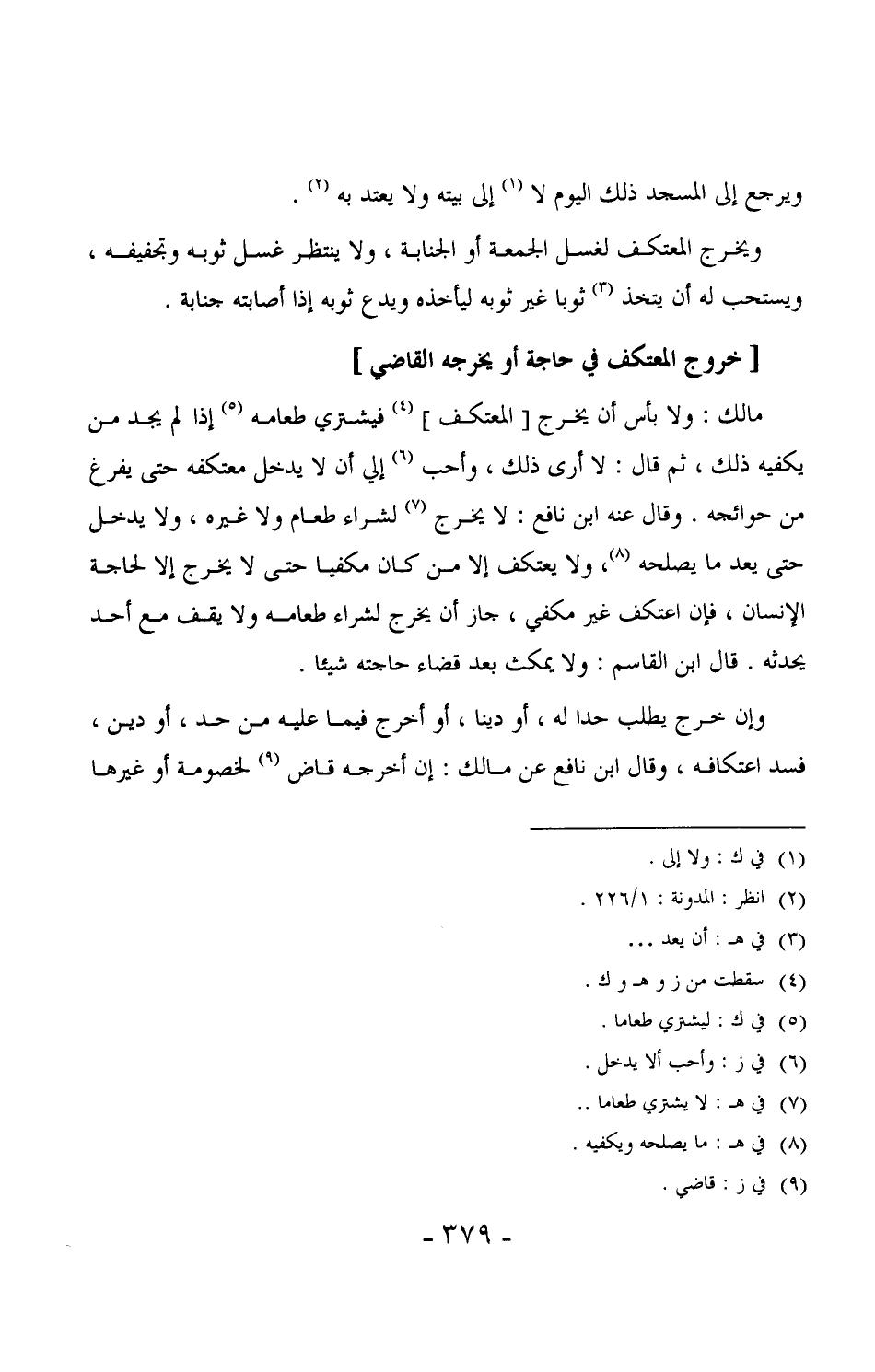 489 - وإن خرج يطلب حداً له، أو ديناً، أو أخرج فيما عليه من حد، أو دين فسد اعتكافه، وقال ابن نافع عن مالك: إن أخرجه قاض لخصومة أو غيرها