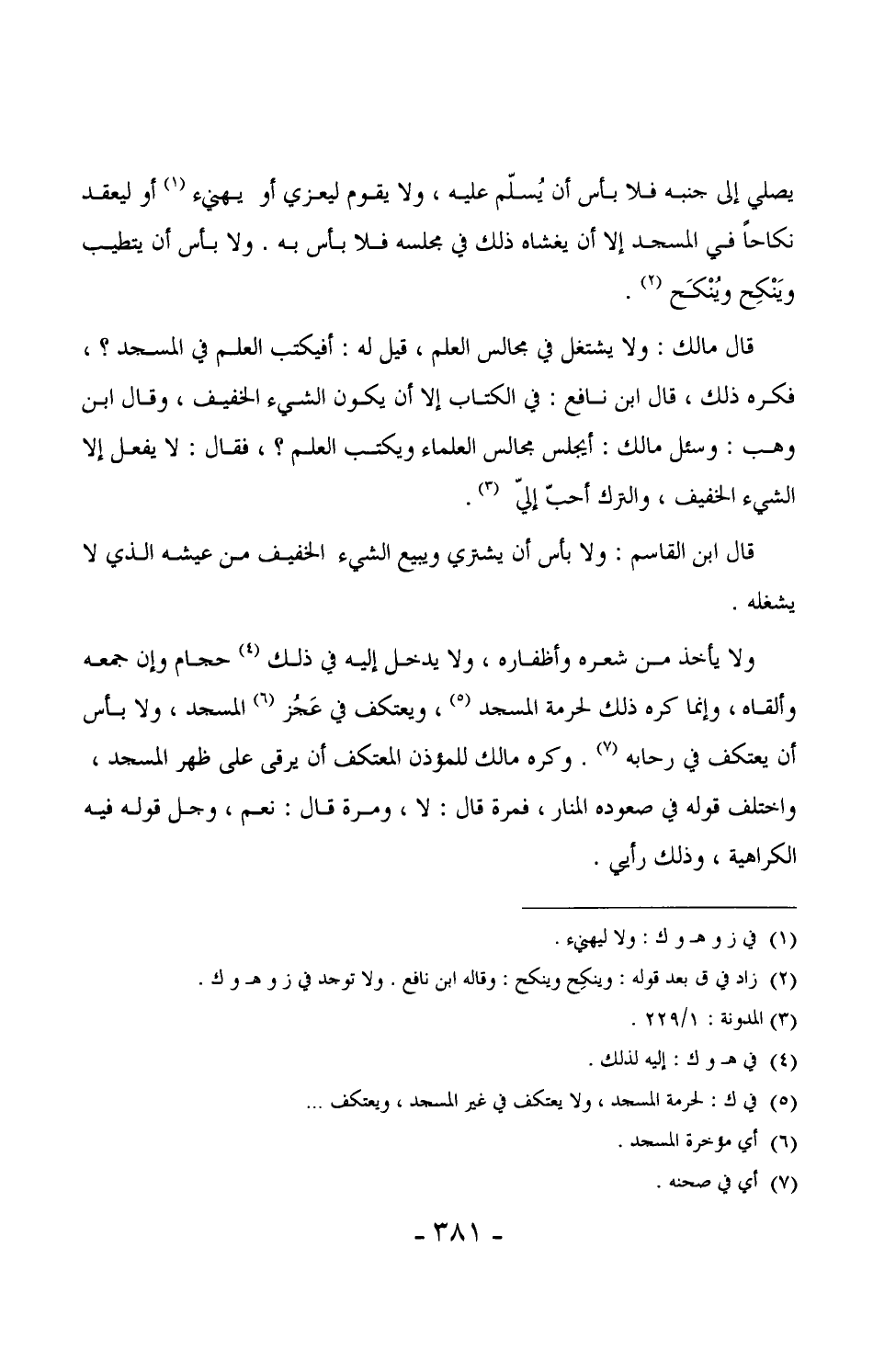 495 - ولا يأخذ من شعره وأظفاره، ولا يدخل إليه في ذلك حجام وإن جمعه وألقاه، وإنما كره ذلك لحرمة المسجد، ويعتكف في عَجُز المسجد، ولا باس أن يعتكف في رحابه. وكره مالك للمؤذن المعتكف أن يرقى على ظهر المسجد، واختلف قوله في صعوده المنار، فمرة قال: لا، ومرة قال: نعم، وجل قوله فيه الكراهية، وذلك رأيي.