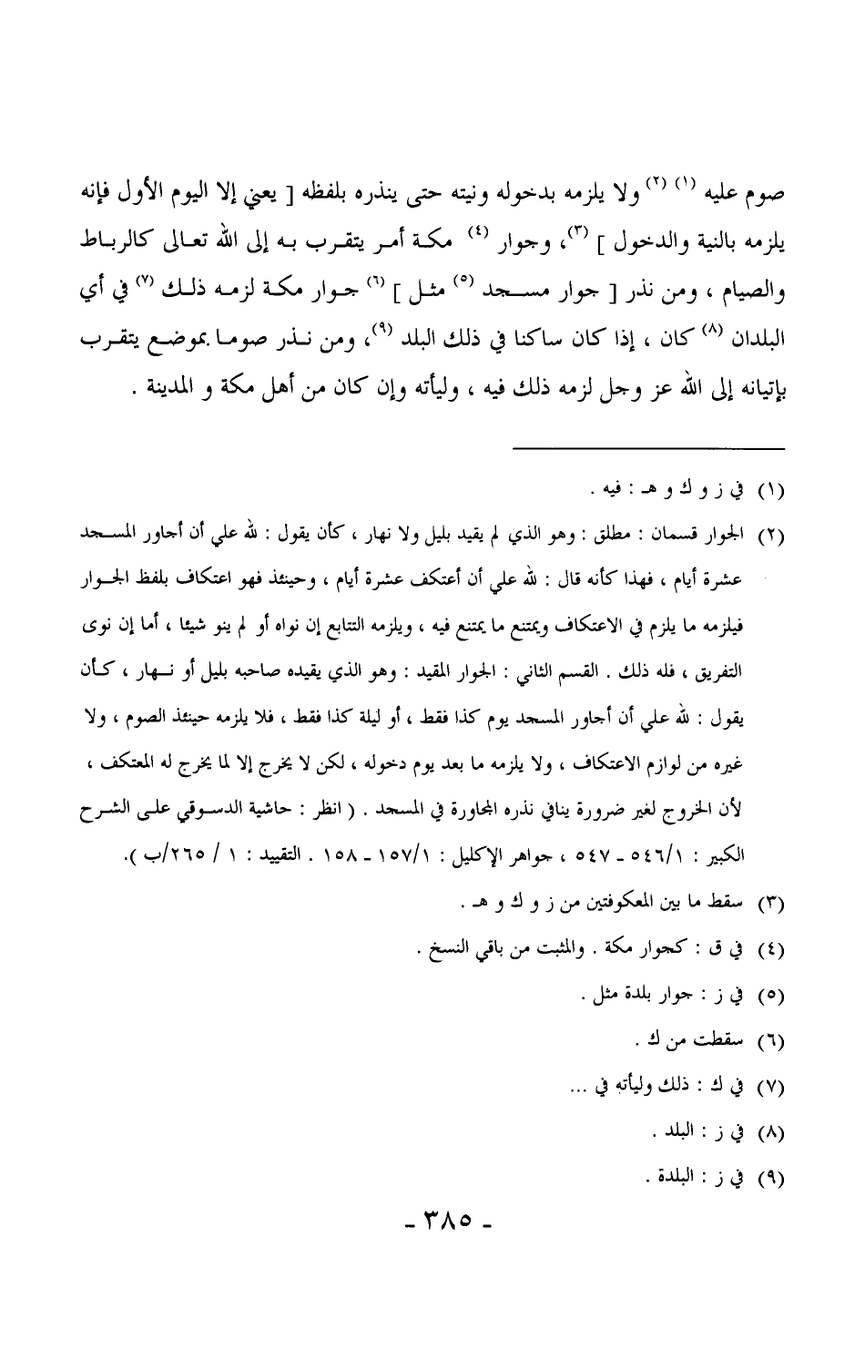 صوم عليه ولا يلزمه بدخوله ونيته حتى ينذره بلفظه [يعني إلا اليوم الأول فإنه يلزمه بالنية والدخول] ، وجوار مكة أمر يتقرب به إلى الله تعالى كالرباط والصيام، ومن نذر [جوار مسجد مثل] جوار مكة لزمه ذلك في أي البلدان كان، إذا كان ساكناً في ذلك البلد، ومن نذر صوماً بموضع يتقرب بإتيانه إلى الله عز وجل لزمه ذلك فيه، وليأته وإن كان من أهل مكة والمدينة.