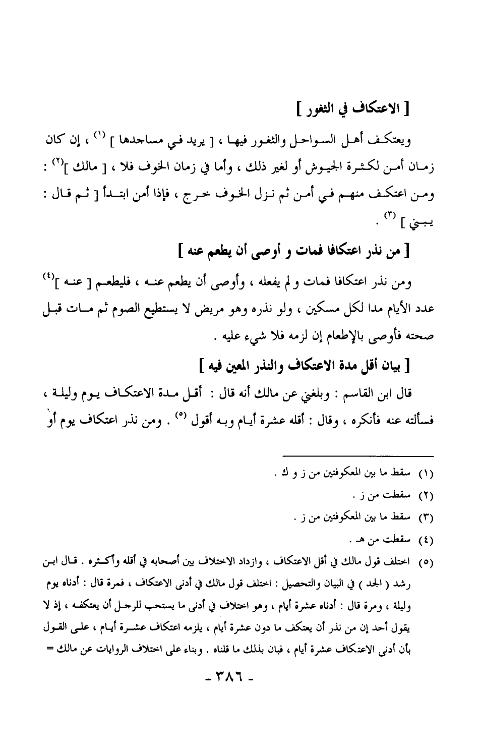 503 - ويعتكف أهل السواحل والثغور فيها، [يريد في مساجدها] ، إن كان زمان أمن لكثرة الجيوش أو لغير ذلك، وأما في زمان الخوف فلا، [مالك] : ومن اعتكف منهم في أمن ثم نزل الخوف خرج، فإذا أمن ابتدأ [ثم قال: يبني] .