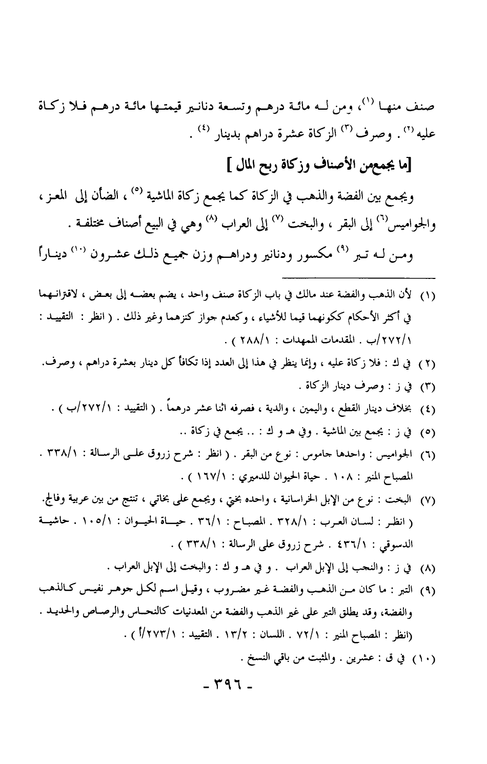 522 - ويجمع بين الفضة والذهب في الزكاة كما يجمع زكاة الماشية، الضأن إلى المعز، والجواميس إلى البقر، والبخت إلى العراب وهي في البيع أصناف مختلفة.