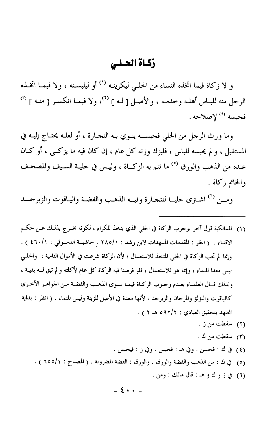 527 - ولا زكاة فيما اتخذه النساء من الحلي ليكرينه أو ليلبسنه، ولا فيما اتخذه الرجل منه للباس أهله وخدمه، والأصل [له] ، ولا فيما انكسر [منه] فحبسه لإصلاحه. (¬1)