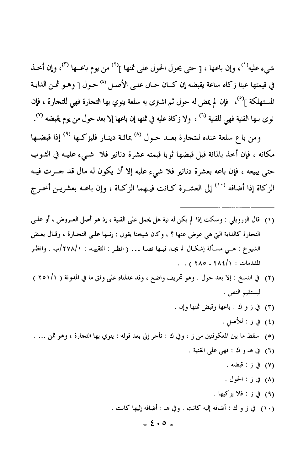 شيء عليه، وإن باعها، [حتى يحول الحول على ثمنه] من يوم باعها، وإن أخذ في قيمتها عيناً زكاه ساعة يقبضه إن كان حال على الأصل حول [وهو ثمن الدابة المستهلكة] ، فإن لم يمض له حول ثم اشترى به سلعة ينوي بها التجارة فهي للتجارة، فإن نوى بها القنية فهي للقنية، ولا زكاة عليه في ثمنها إن باعها إلا بعد حول من يوم يقبضه.