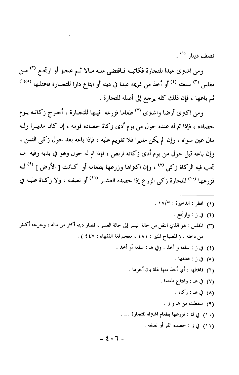 540 - ومن اكترى أرضاً واشترى طعاماً فزرعه فيها للتجارة، اخرج زكاته يوم حصاده، فإذا تم له عنده حول من يوم أدى زكاة حصاده قومه، إن كان مدبراً وله مال عين سواه، وإن لم يسكن مدبراً فلا تقويم عليه، فإذا باعه بعد حول زكى الثمن، وإن باعه قبل حول من يوم أدى زكاته تربص، فإذا تم له حول وهو في يديه وفيه ما تجب فيه الزكاة زكى، وإن اكنزاها وزرعها بطعامه أو كانت [الأرض] له فزرعها للتجارة زكى الزرع إذا حصده العشر أو نصفه، ولا زكاة عليه في