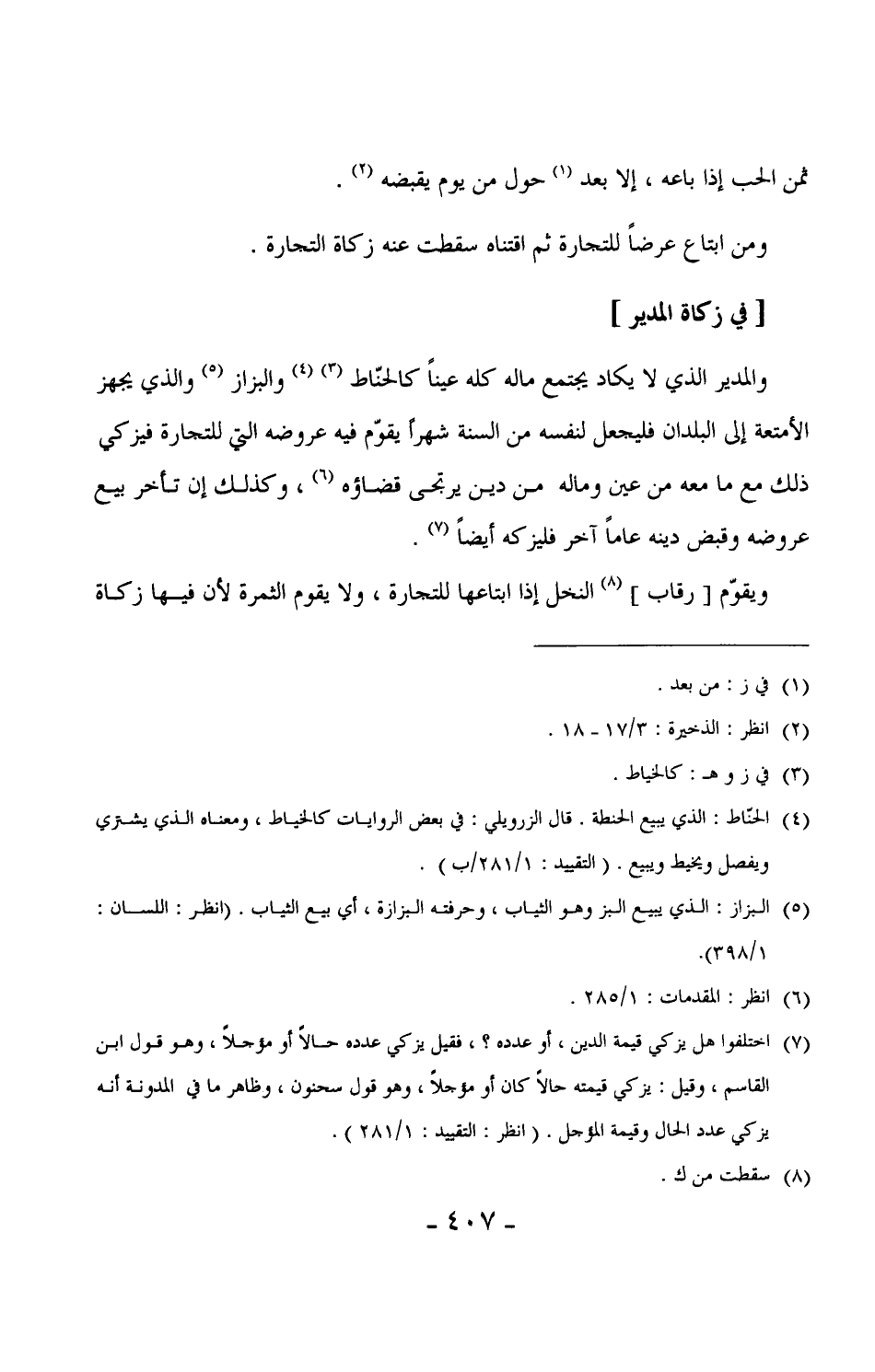 542 - والمدبر الذي لا يكاد يجتمع ماله كله عيناً كالحنّاط (¬1) ، والبزاز (¬2) ، والذي يجهز الأمتعة إلى البلدان فليجعل لنفسه من السنة شهراً يقوّم فيه عروضه التي للتجارة فيزكي ذلك مع ما معه من عين وماله ومن دين يرتجى قضاؤه، وكذلك إن تأخر بيع عروضه وقبض دينه عاماً آخر فليزكه أيضاً.
