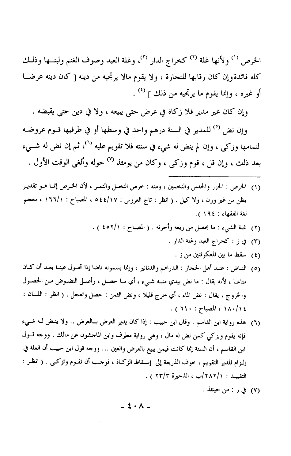 الخرص ولأنها غلة كخراج الدار، وغلة العبد وصوف الغنم ولبنها وذلك كله فائدة وإن كان رقابها للتجارة، ولا يقوم مالاً يرتجيه من دينه [كان دينه عرضاً أو غيره، وإنما يقوم ما يرتجيه من ذلك] .