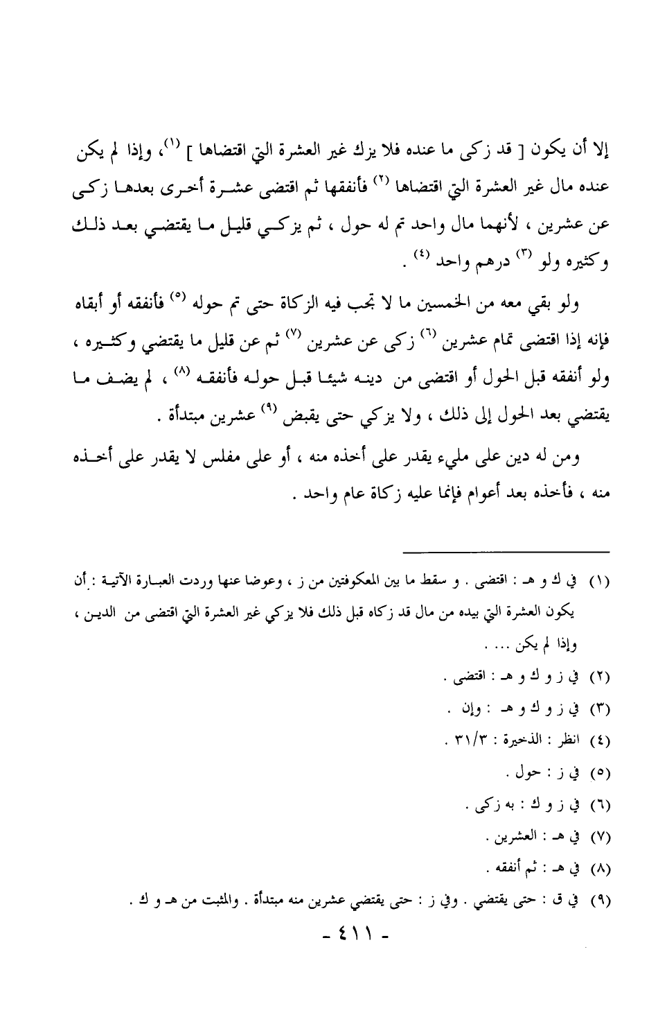 548 - ولو بقي معه من الخمسين ما لا تجب فيه الزكاة حتى تم حوله فأنفقه أو أبقاه فإنه إذا اقتضى تمام عشرين زكى عن عشرين ثم عن قليل ما يقتضي وكثيره، ولو أنفقه قبل الحول أو اقتضى من دينه شيئاً قبل حوله فأنفقه، لم يضف ما يقتضي بعد الحول إلى ذلك، ولا يزكي حتى يقبض عشرين مبتدأة.